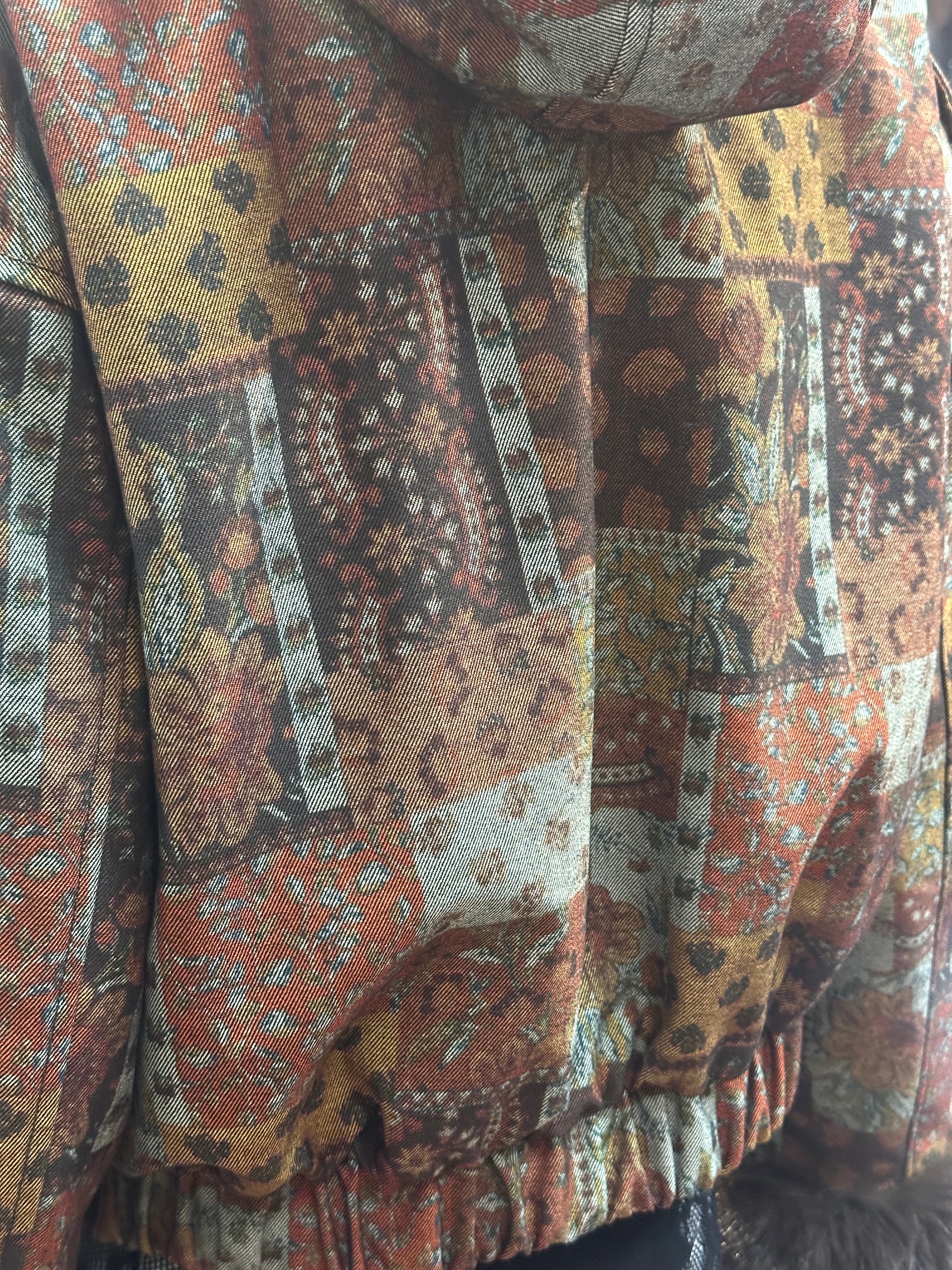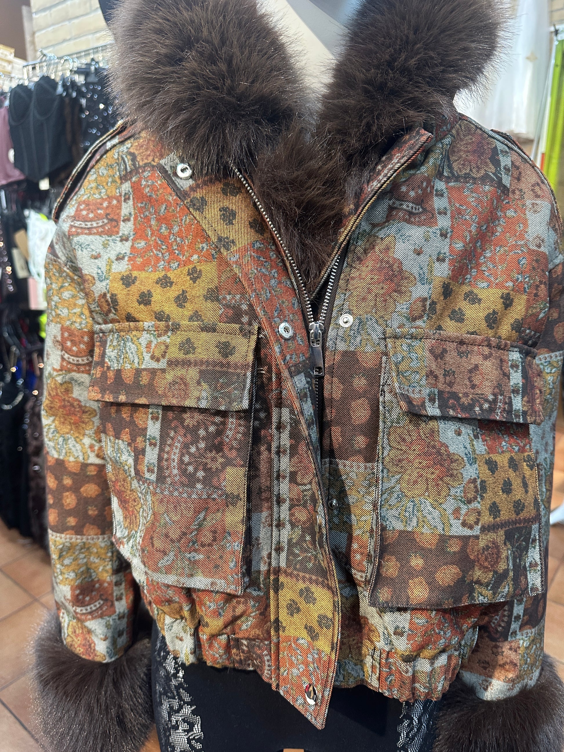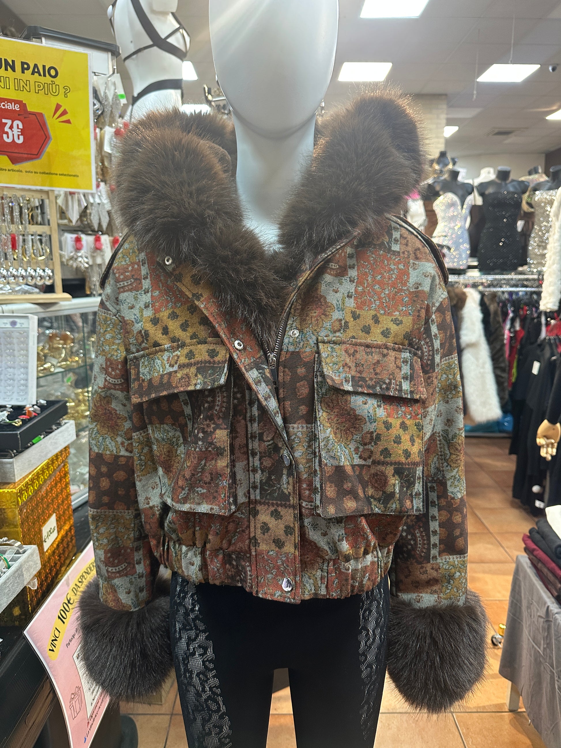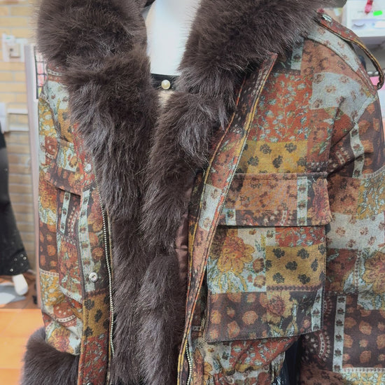 • Dettagli estetici: Collo e polsini rifiniti in Eco-Pelliccia. Chiusura zip e tasche frontali con patta. Stampa Patchwork esclusiva.