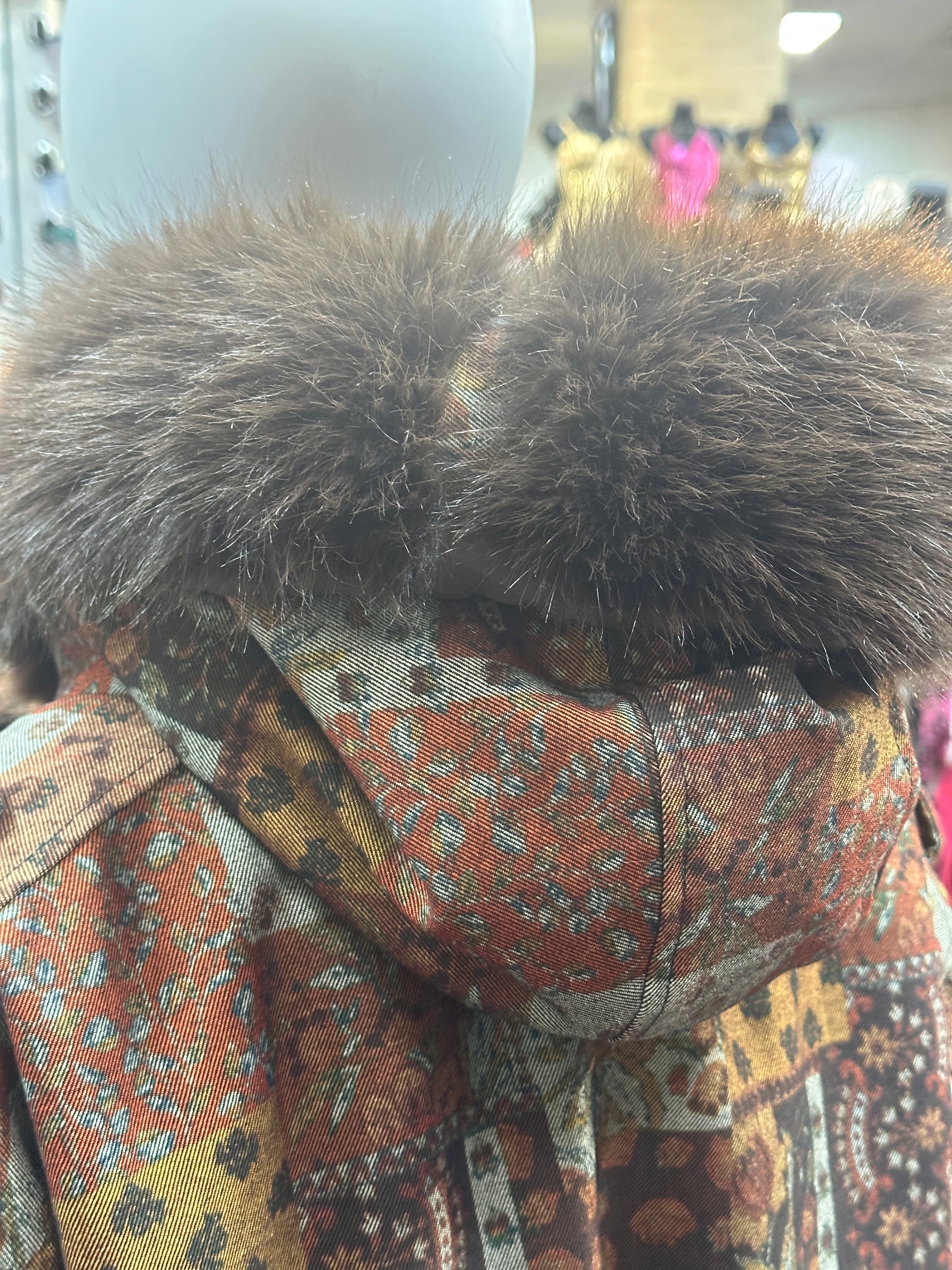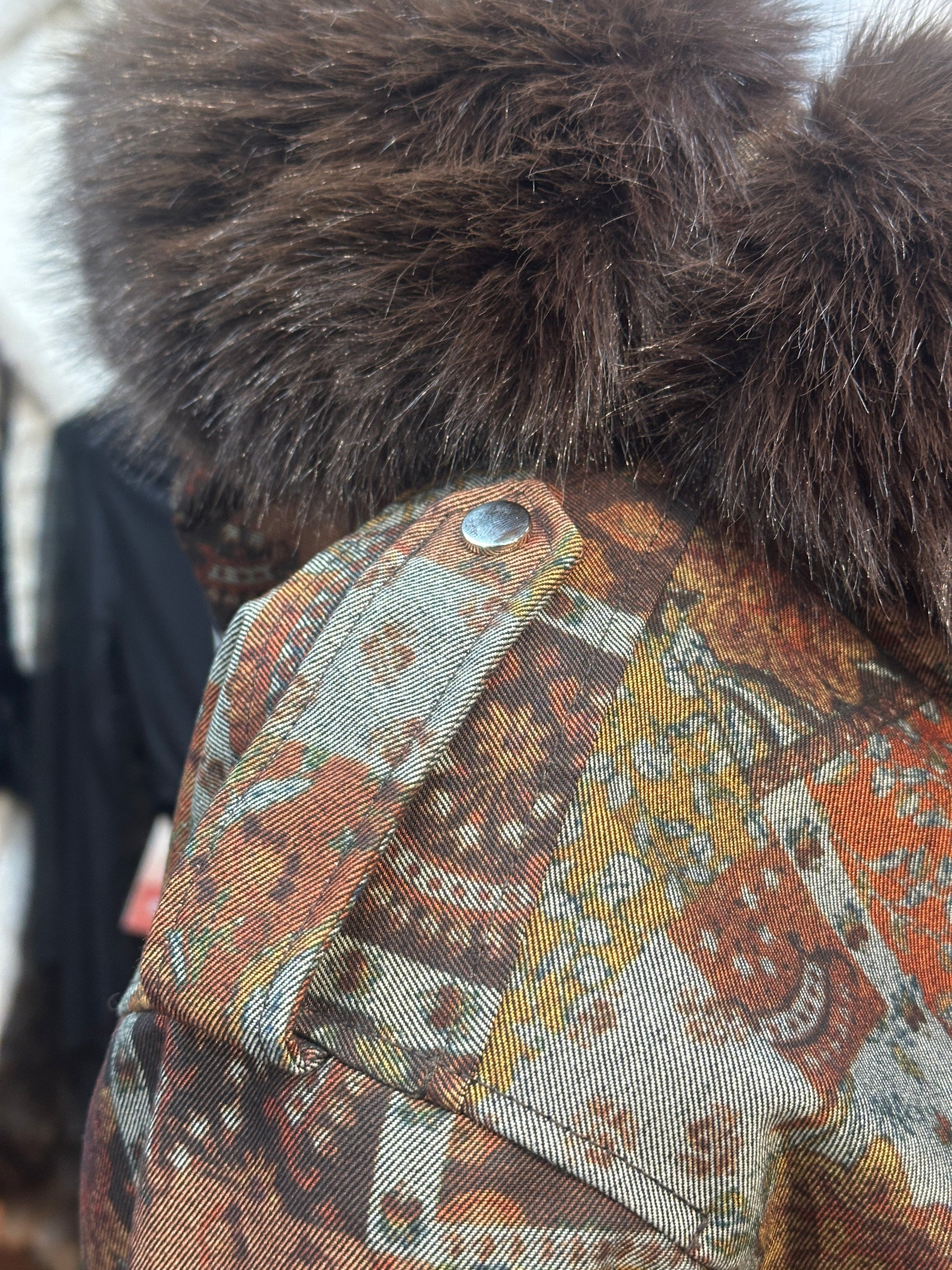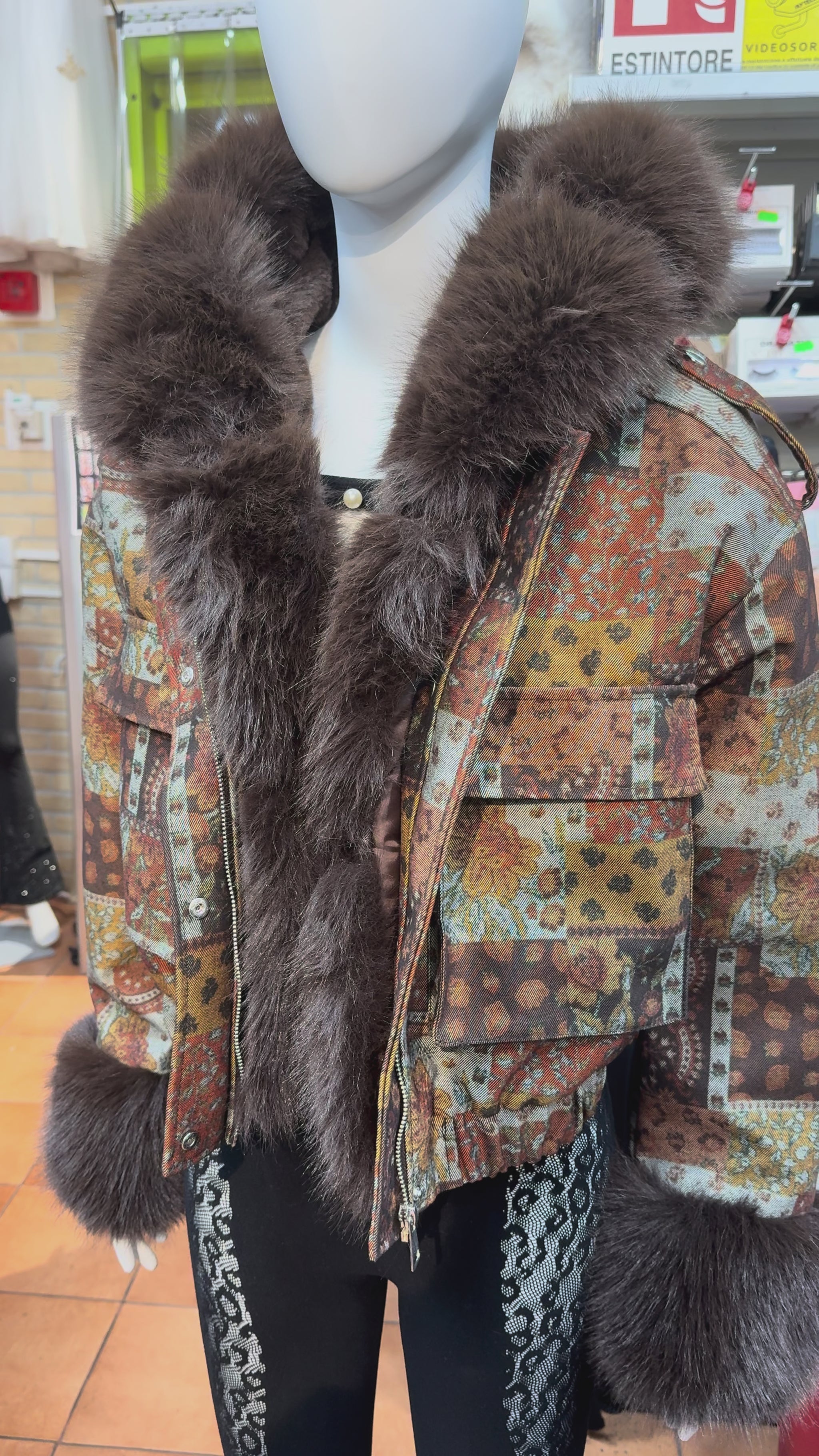 • Colori disponibili: Fantasia multitonale nei colori Caldi (marrone, arancio, beige) con dettagli in pelliccia marrone scuro.