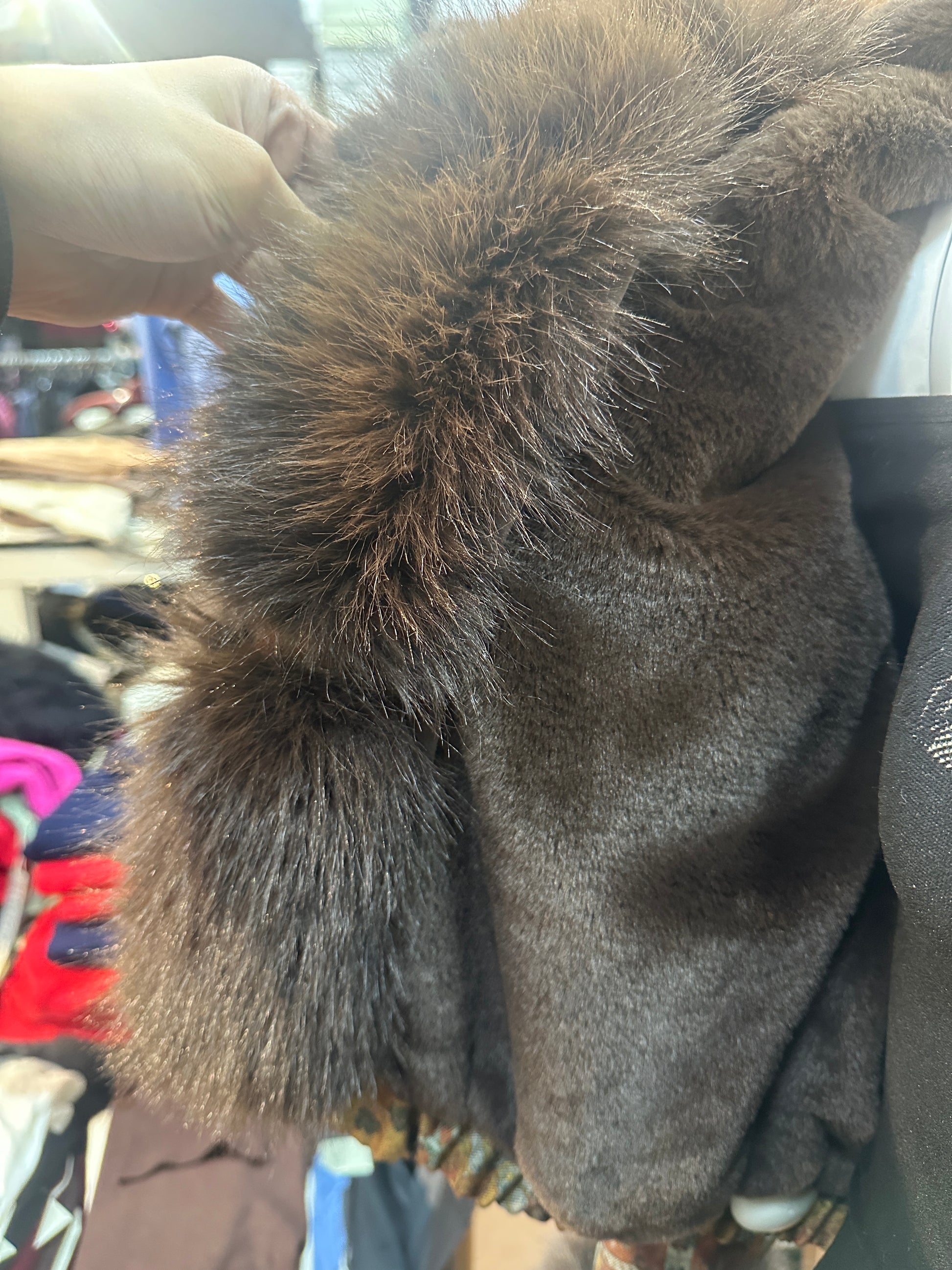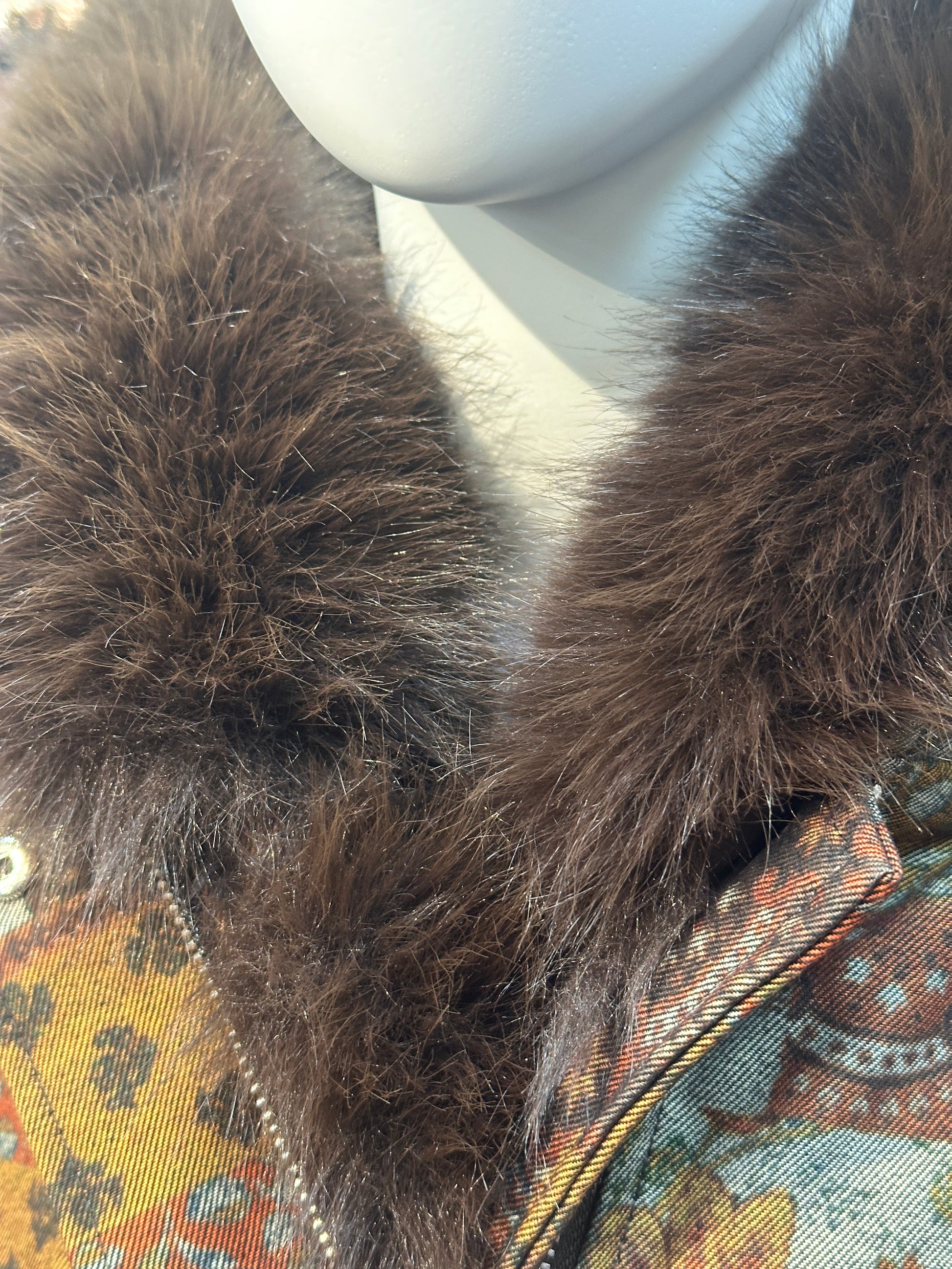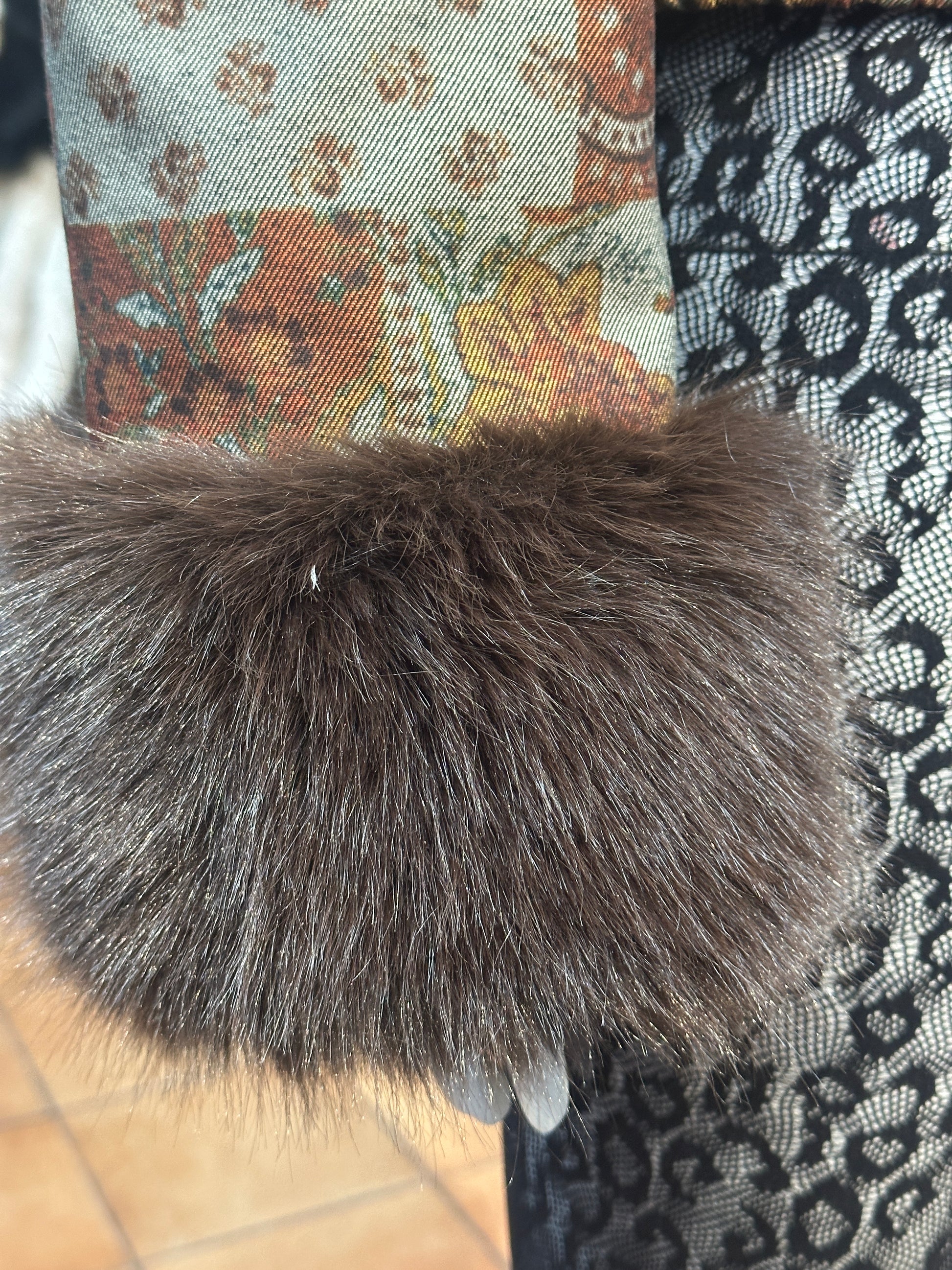 • Colori disponibili: Fantasia multitonale nei colori Caldi (marrone, arancio, beige) con dettagli in pelliccia marrone scuro.
