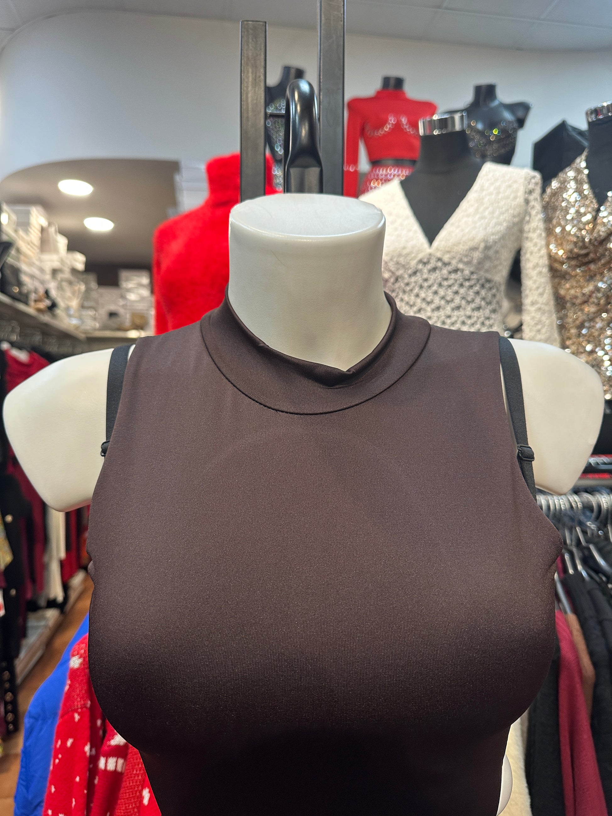 Dettagli principali: Design a collo alto (lupetto), senza maniche con spalle scoperte e profonda scollatura posteriore che lascia la schiena nuda.