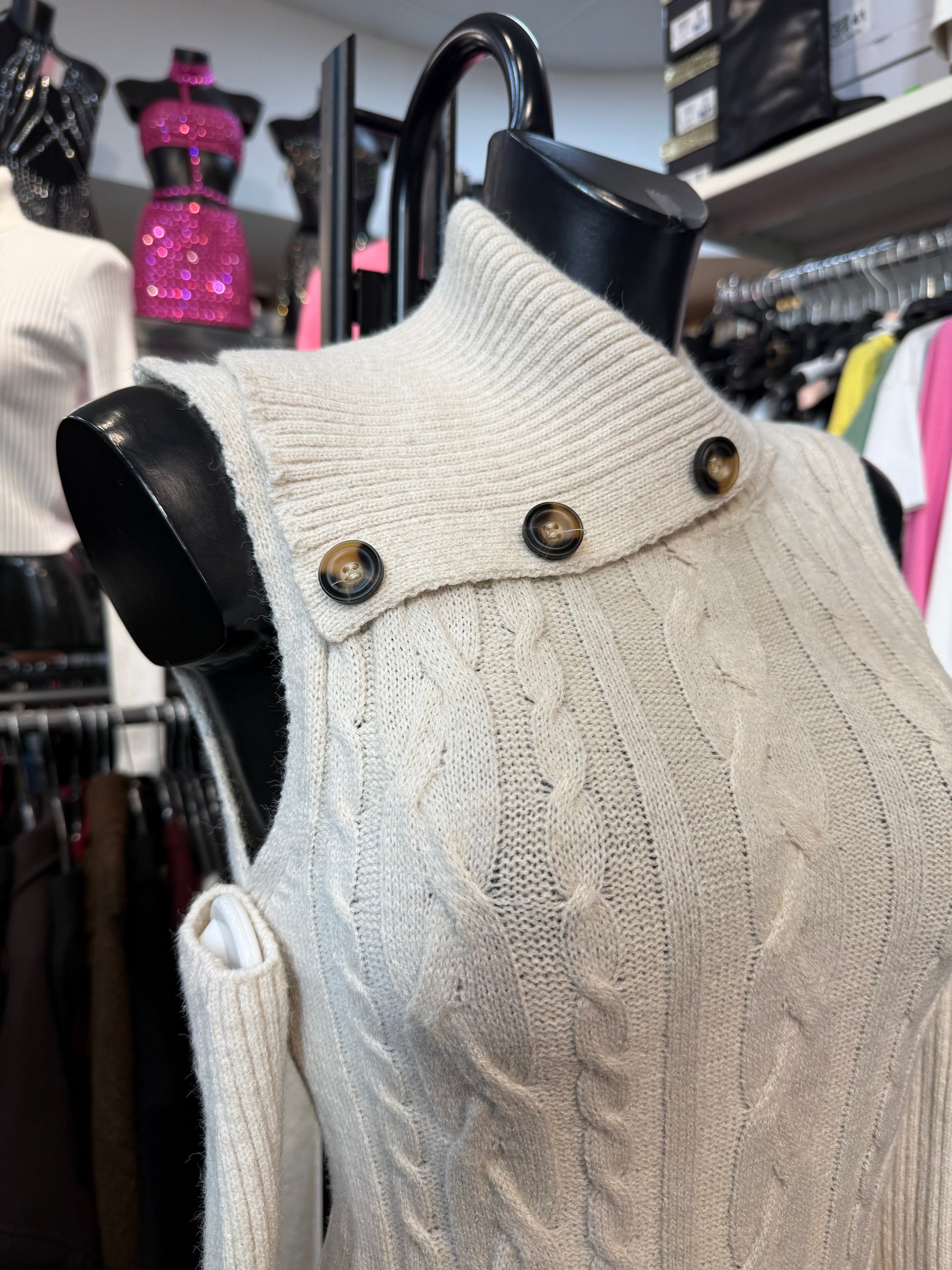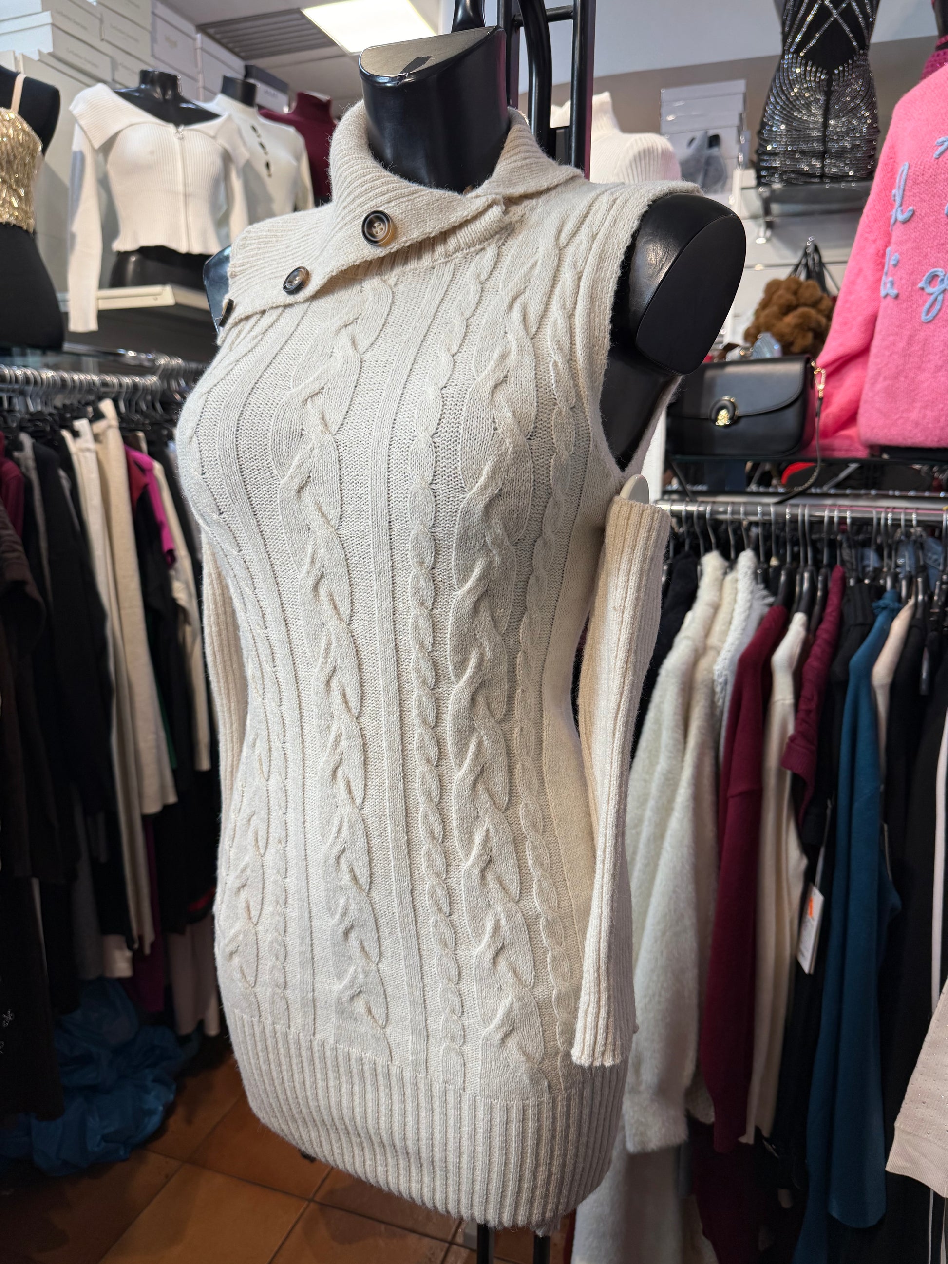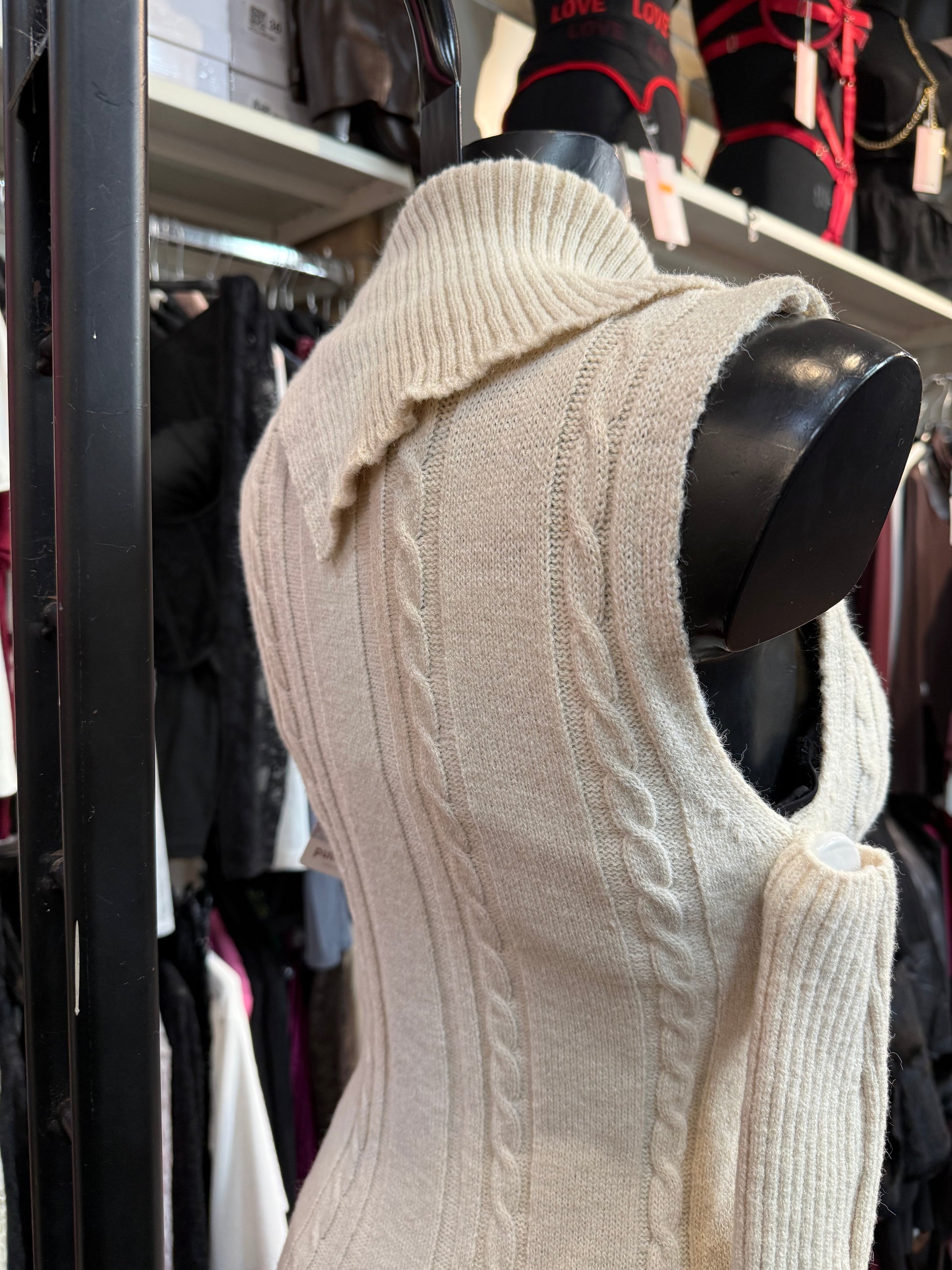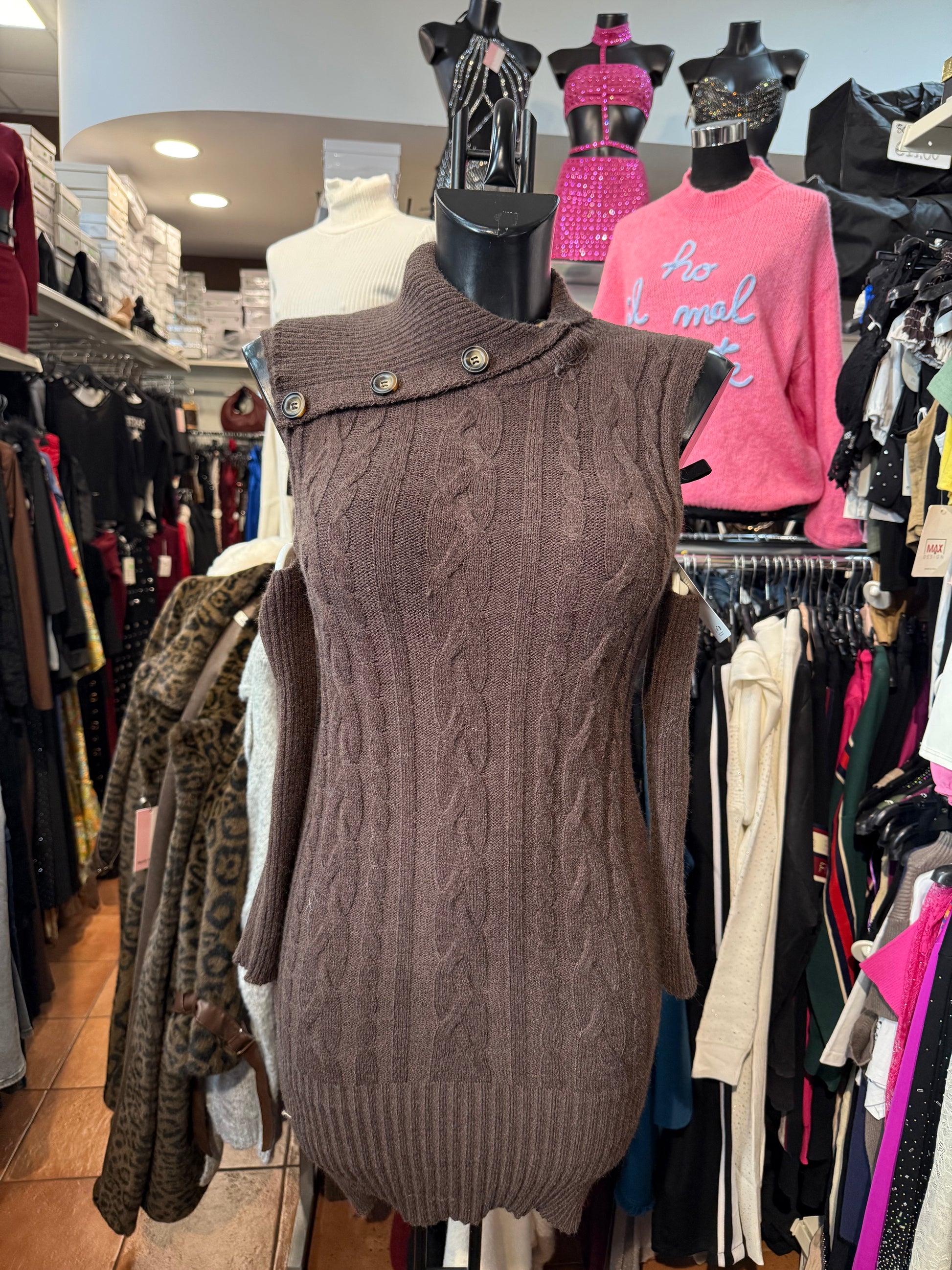 • Aesthetic details: Asymmetrical high collar with decorative buttons, cold shoulder, sleeves separated from the dress, cable knit all over the body.