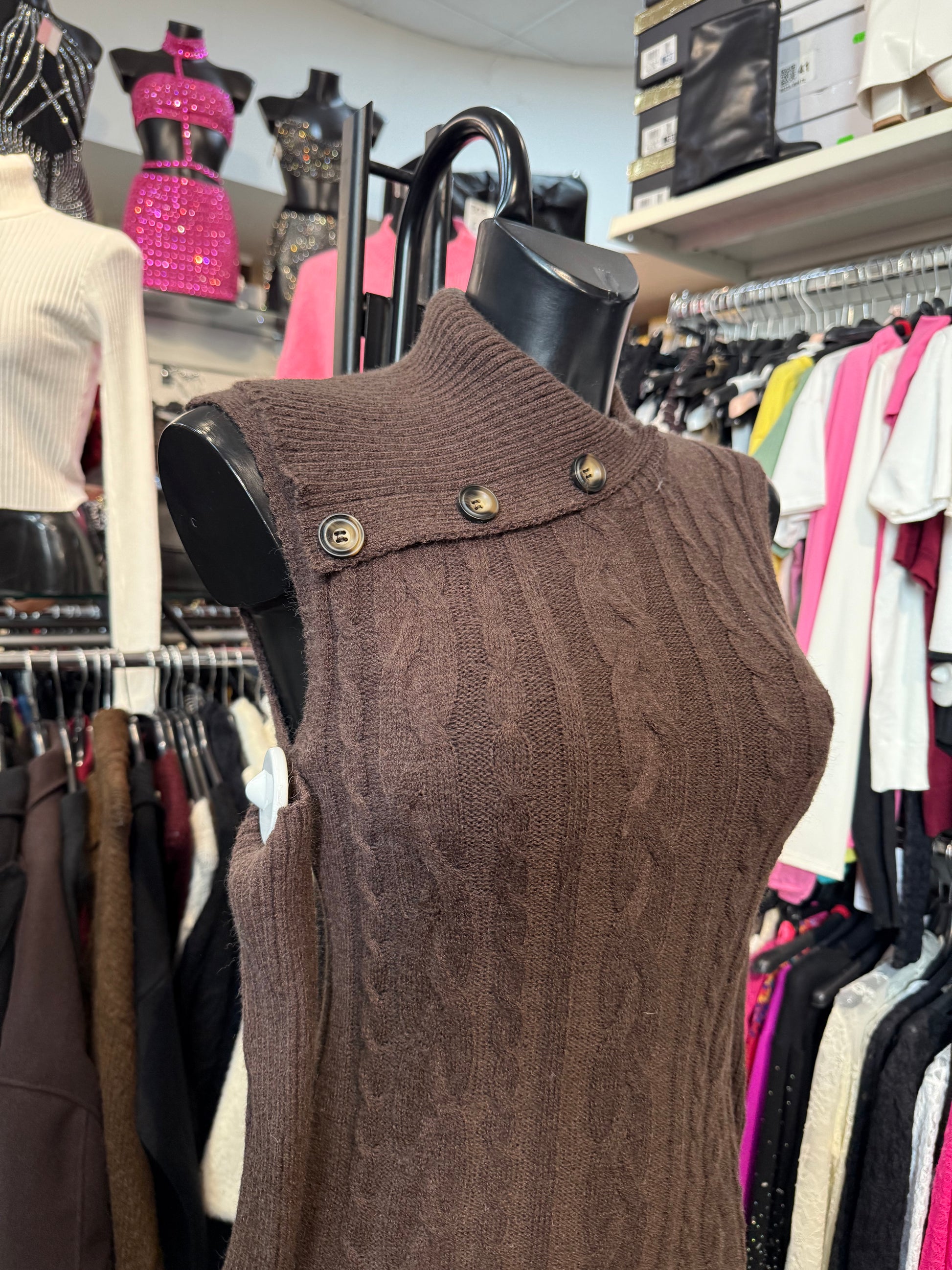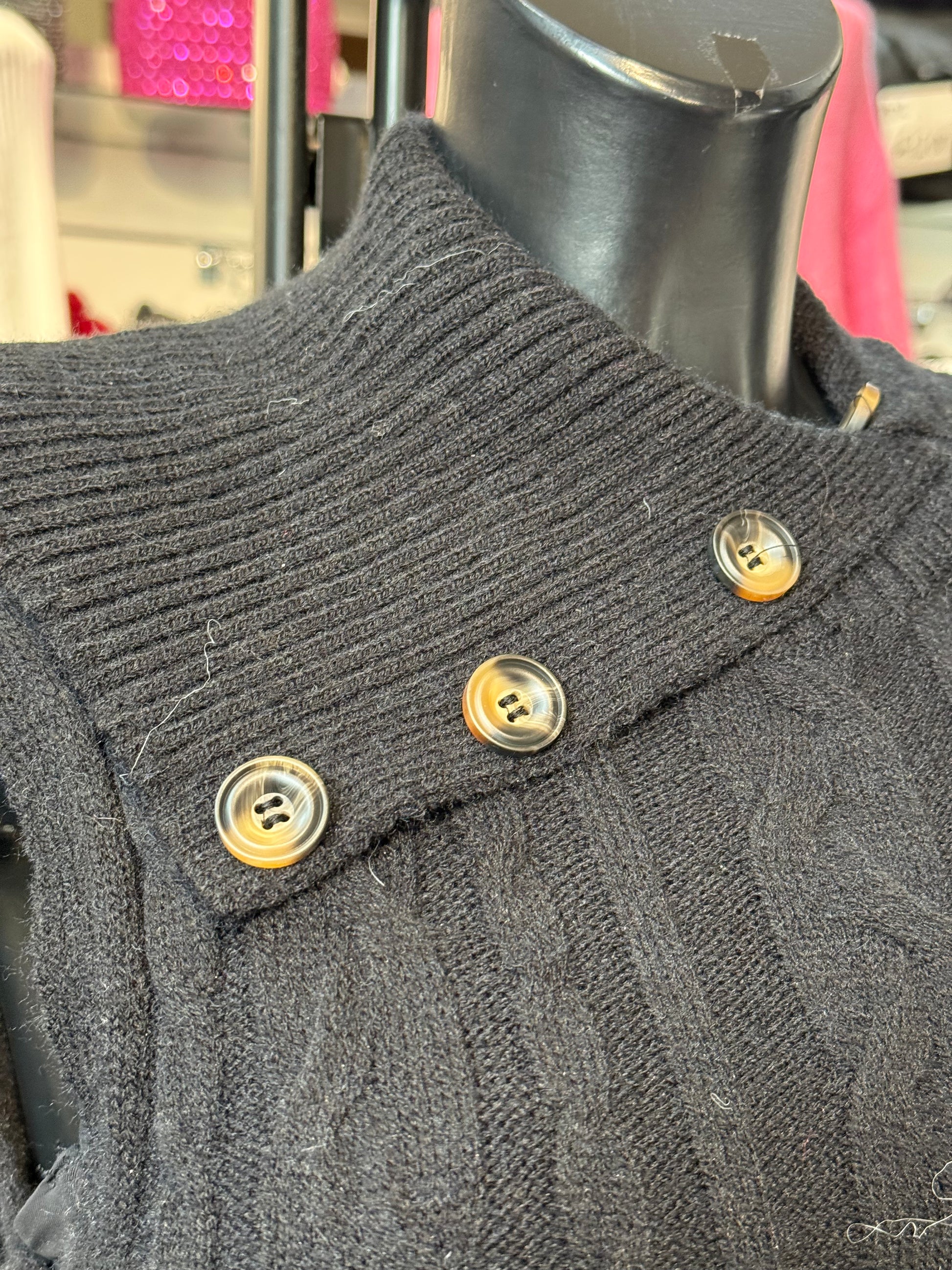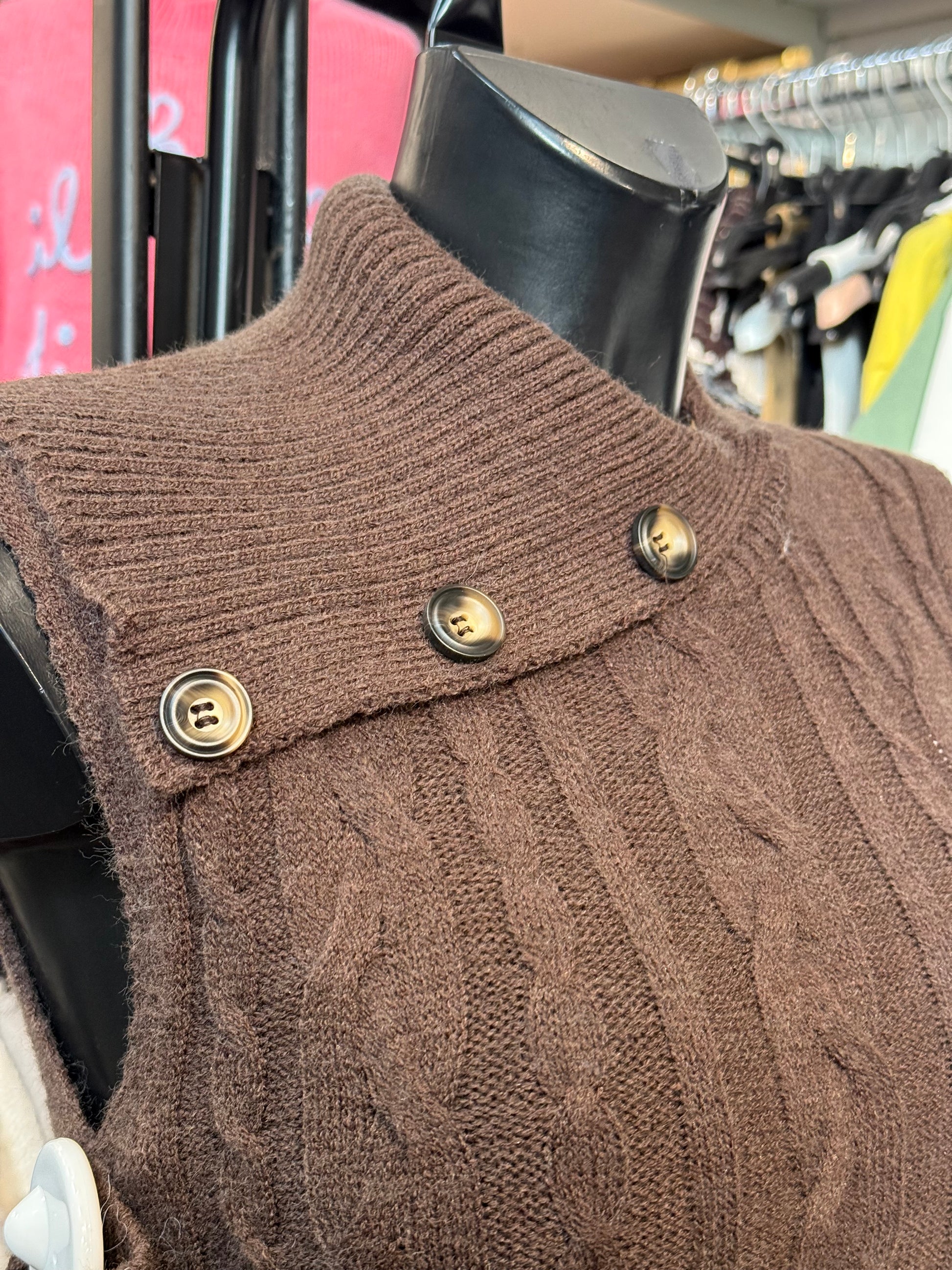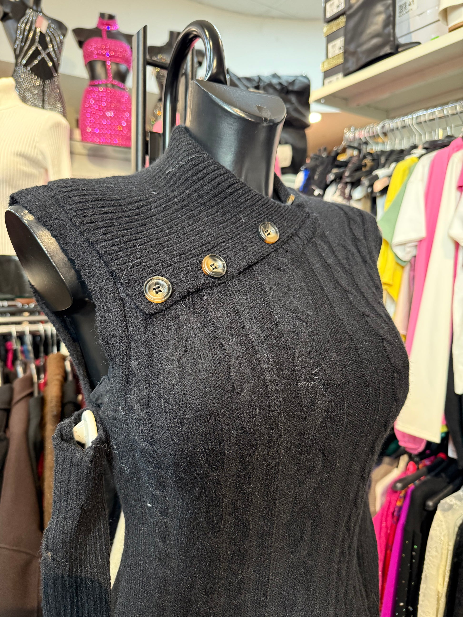 • Aesthetic details: Asymmetrical high collar with decorative buttons, cold shoulder, sleeves separated from the dress, cable knit all over the body.
