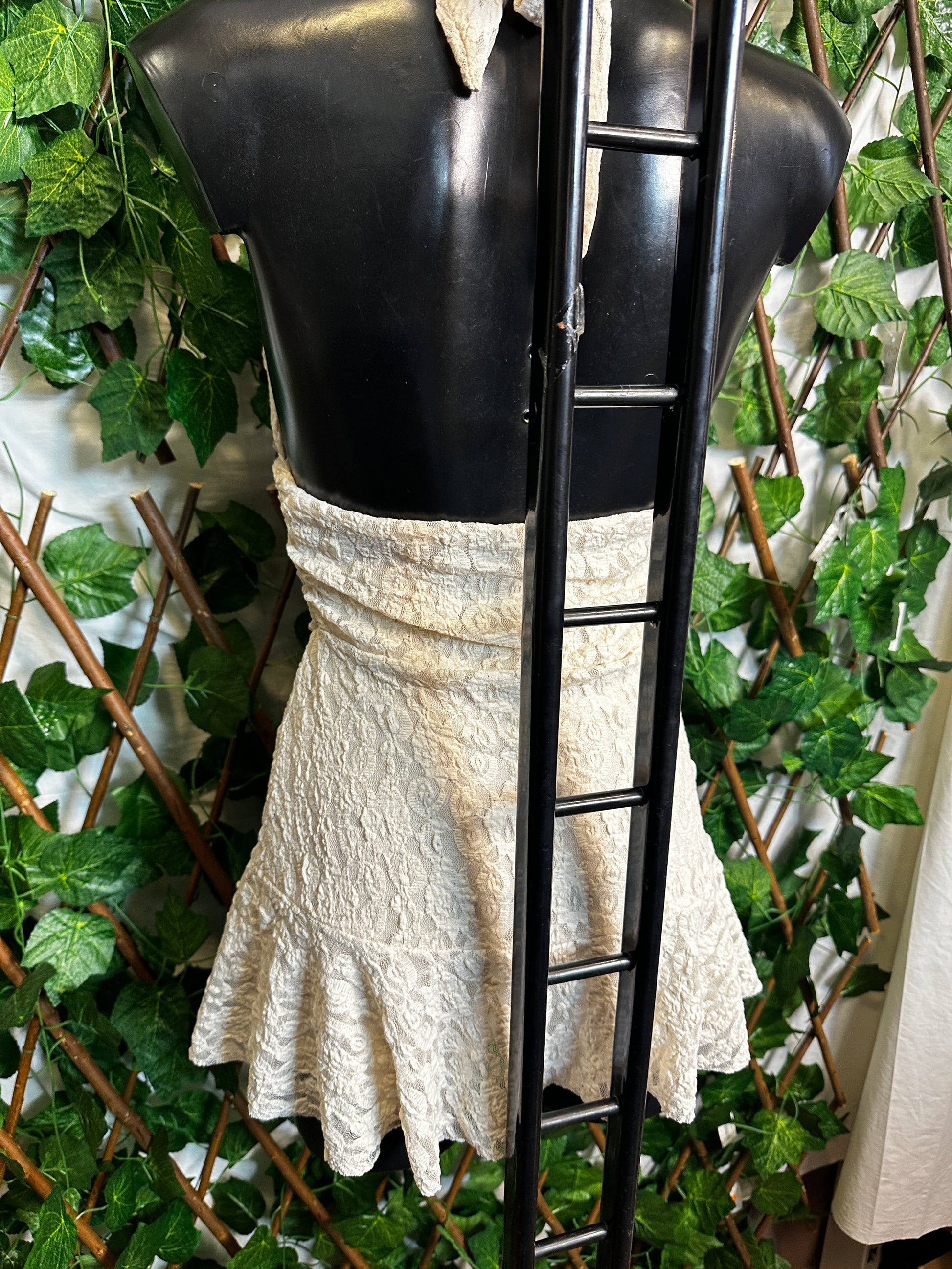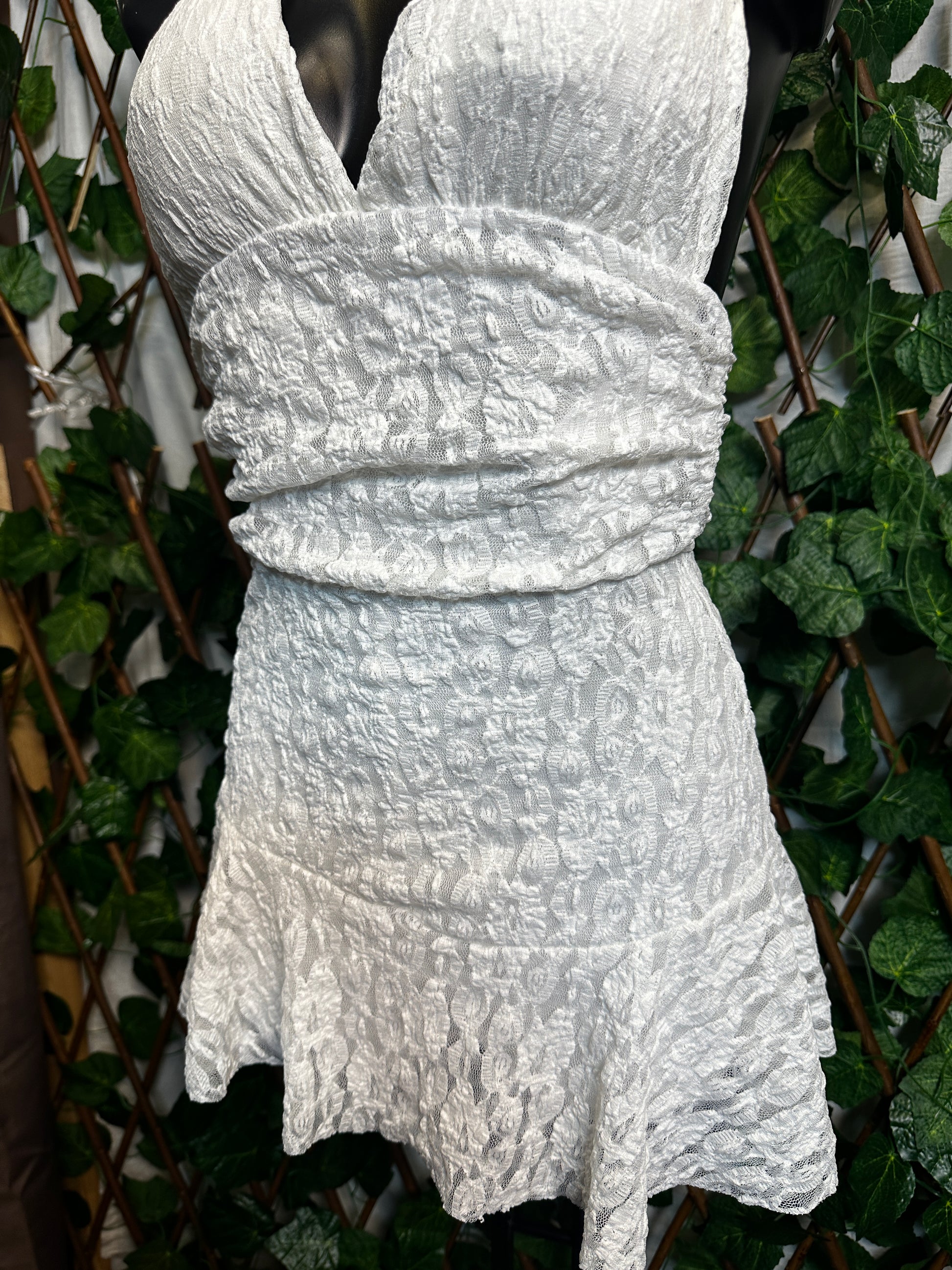 Crepe style: deep neckline with cups and open back, with shorts tucked in | one size