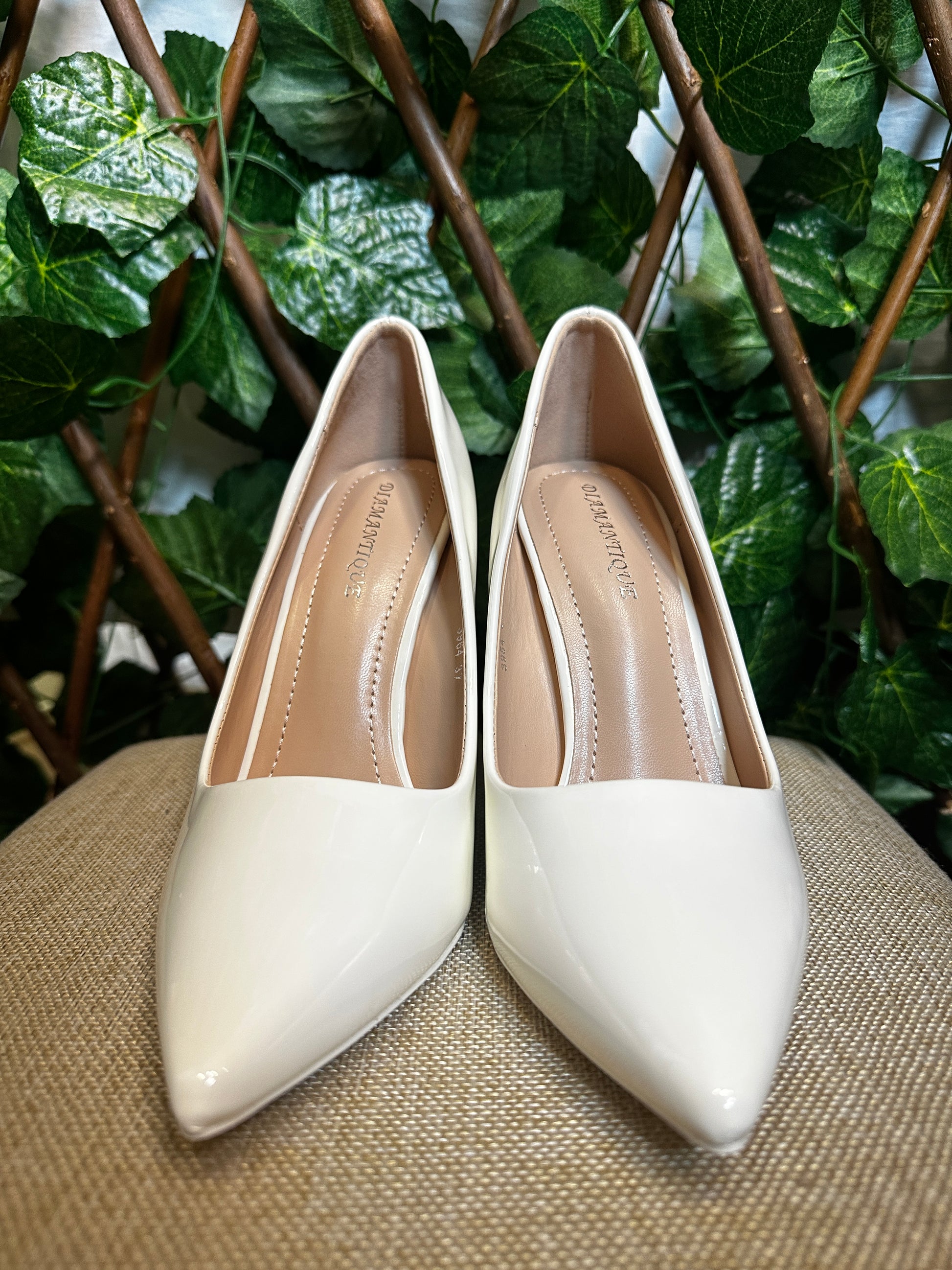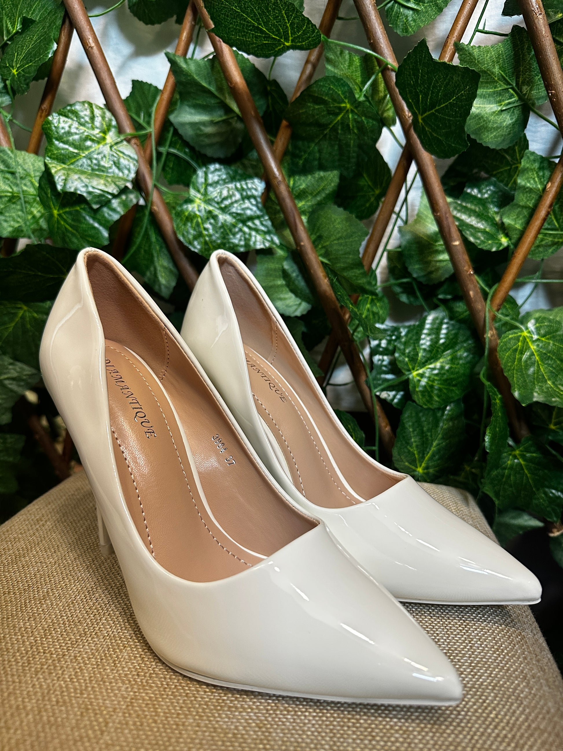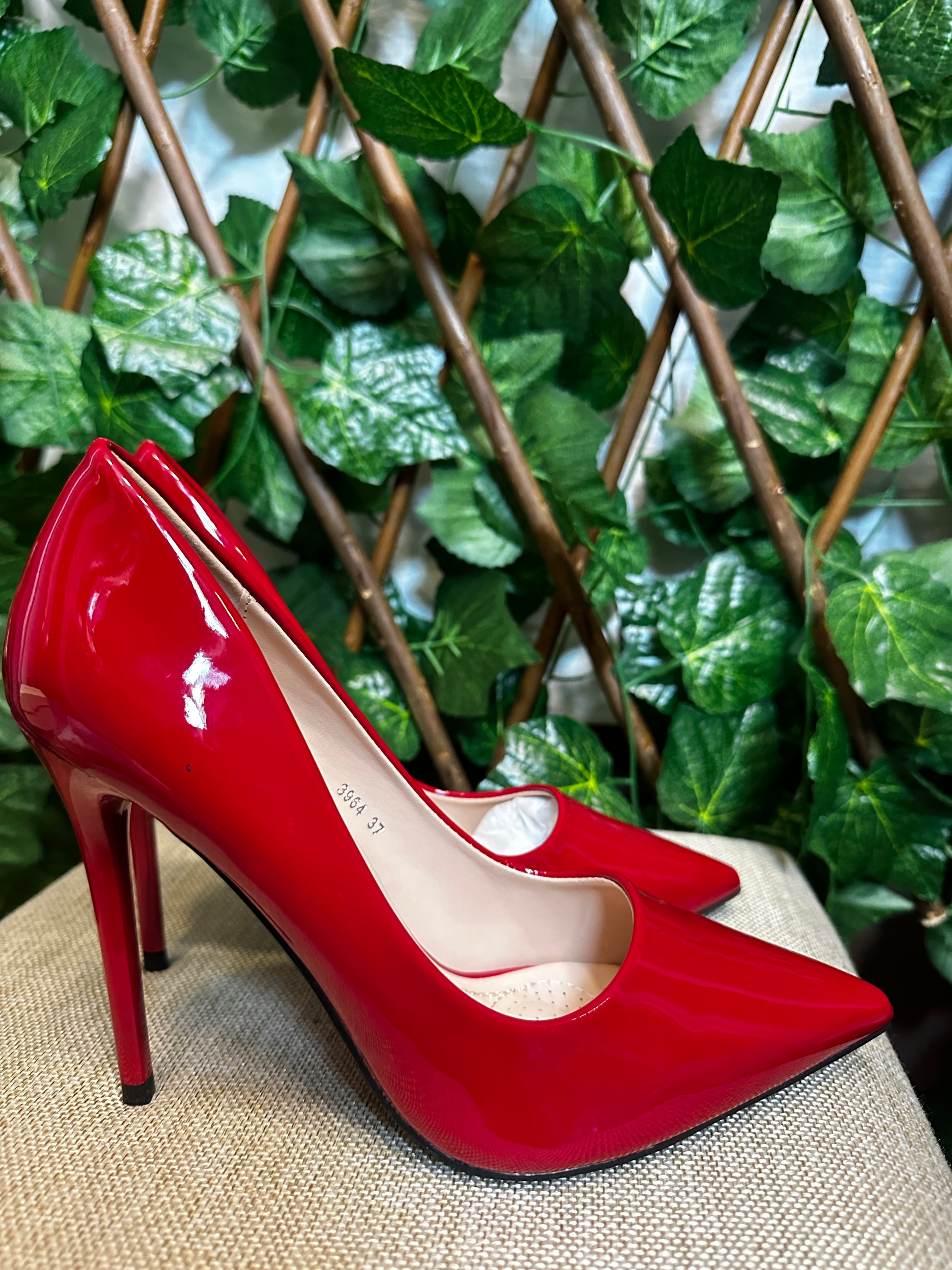 • Aesthetic details: High stiletto heel (approximately 10 cm), pointed toe (stiletto), classic neckline, shiny patent leather finish.