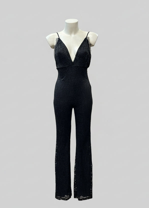 Appena la indossi, senti l'energia magnetica del pizzo che avvolge la tua silhouette come una seconda pelle, rendendoti immediatamente audace e sicura di te. Questa non è una semplice tuta, ma un pezzo di design creato per chi ama dominare la scena con eleganza e mistero. Quando entri nel locale, tutti ti guardano: la profonda scollatura a V, rifinita con ciglia di pizzo delicate, cattura ogni sguardo, mentre la schiena completamente scoperta sprigiona una sensualità inarrestabile. Il pantalone a zampa, interamente ricamato, accompagna ogni tuo movimento con fluidità e grazia, perfetto per chi vuole brillare in discoteca o durante un evento speciale. Sentiti bellissima e invincibile, avvolta in una trama che celebra la tua femminilità più profonda. Vivi la notte da protagonista con un outfit che parla di puro fascino.
