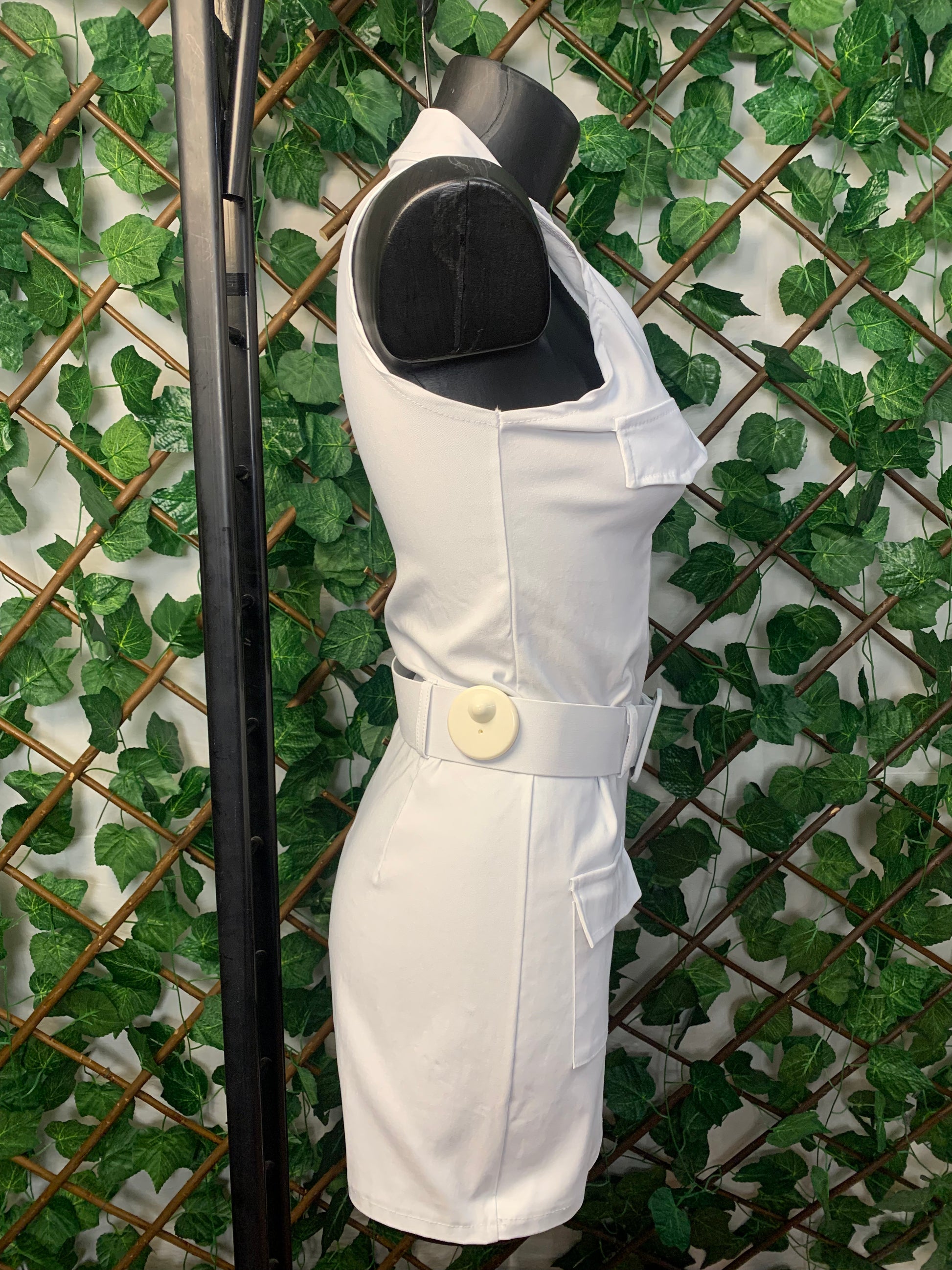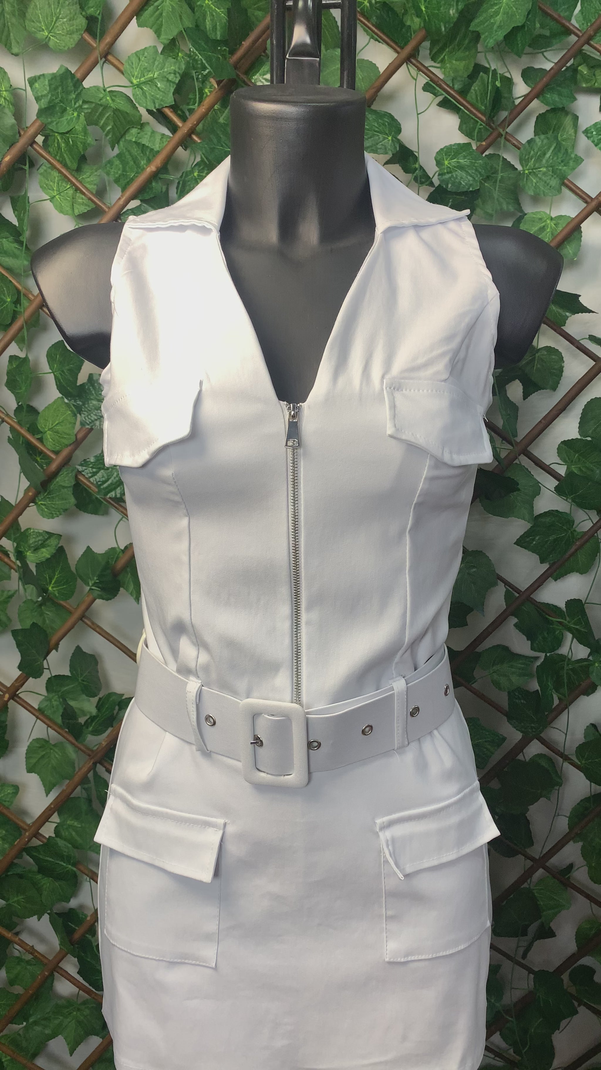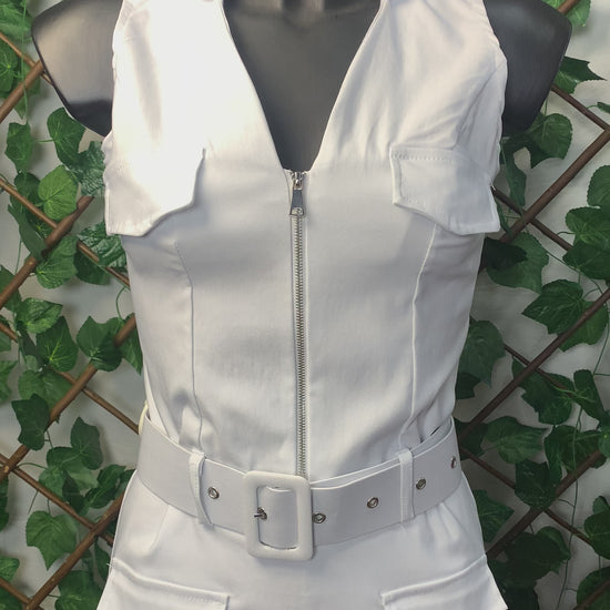 This white dress is the perfect blend of military style and explosive femininity. The cut is crisp, straight, and structured, with a front zip and wide shoulder straps that flatter the figure and add character. The detail that makes the difference? The utility pockets and matching belt with a maxi buckle: it sculpts the waist and adds an incredible urban touch!