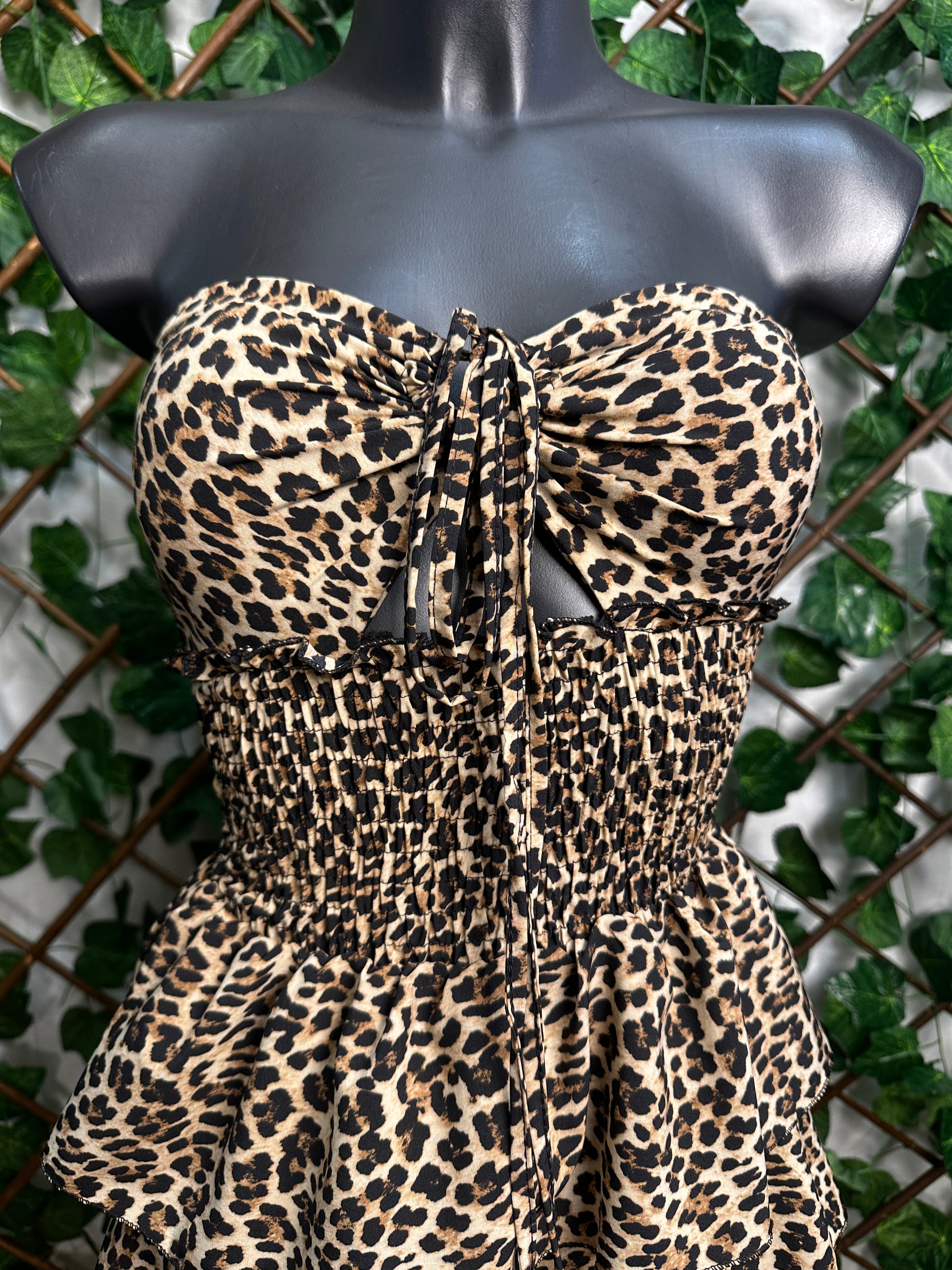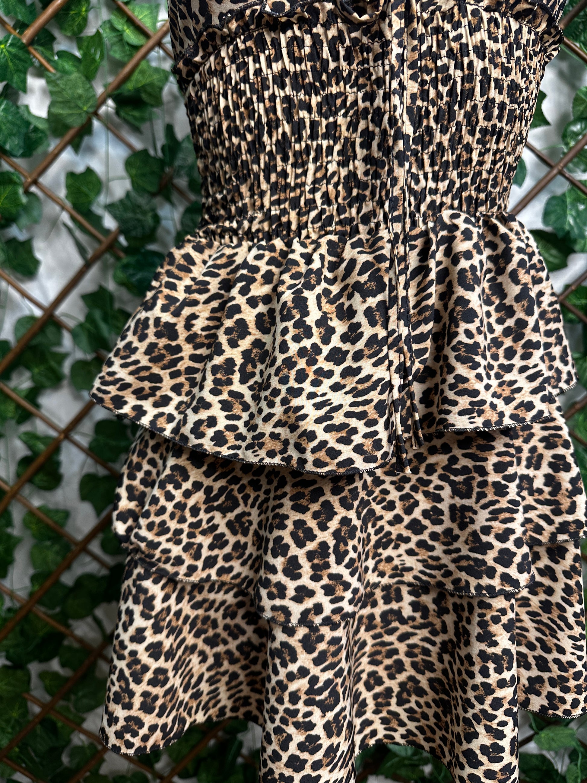 This short leopard print dress is the perfect piece for those who love to stand out without sacrificing elegance. The top with built-in cups accentuates the décolleté, while the flared skirt adds movement and lightness to the look.
