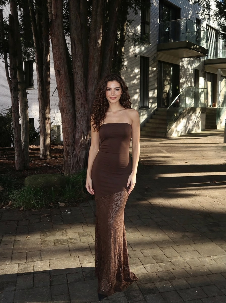 VELLUTO SEGRETO è l'abito che unisce la vestibilità aderente di una seconda pelle alla seduzione eterea del pizzo. La parte superiore a fascia modella il busto e le curve 🍑 con coppe integrate, garantendoti un supporto perfetto per ballare senza pensieri.