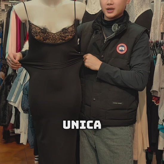 Eleganza allo stato puro con un tocco di mistero. Questo abito lungo è stato creato per le tue occasioni più esclusive: la silhouette scivola armoniosamente lungo il corpo, mentre la parte superiore è impreziosita da un inserto in pizzo floreale dal design unico che incornicia il décolleté con estrema grazia.