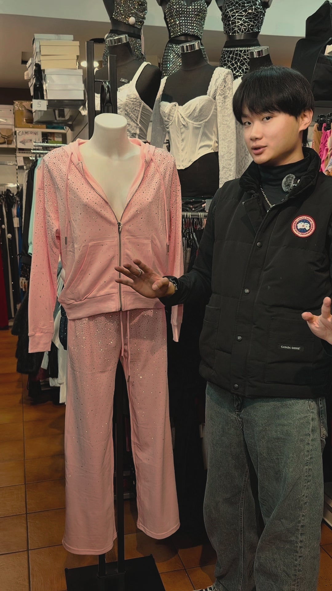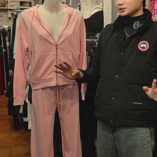 Preparati a brillare come non mai. Il nostro completo "Urban Glow" è pensato per la donna che vuole sentirsi una stella anche nella quotidianità. La morbida tonalità rosa pastello è impreziosita da una pioggia di micro-strass e brillantini che catturano la luce a ogni tuo movimento, creando un effetto magico e sofisticato.