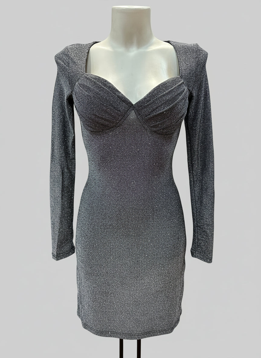 Lo scollo a cuore profondo modella e sostiene il décolleté (stile corsetto), esaltando le tue curve 🍑 con sensualità ineguagliabile. Le maniche lunghe aderenti bilanciano la lunghezza mini, creando un look elegante e audace allo stesso tempo. Scegli il Nero magnetico ⚫️ o l'Argento galattico 💎 per dominare la pista con il tuo ritmo.