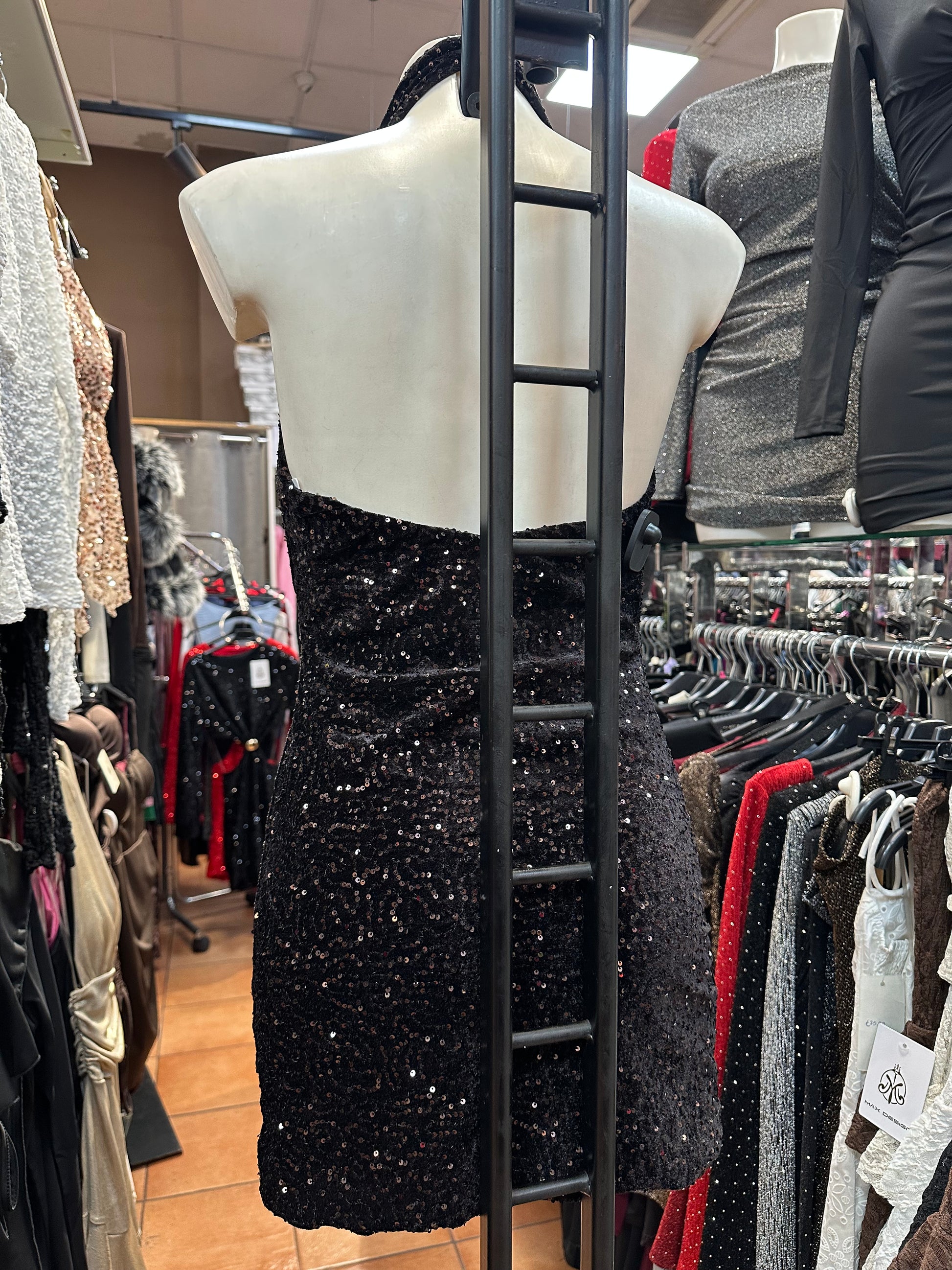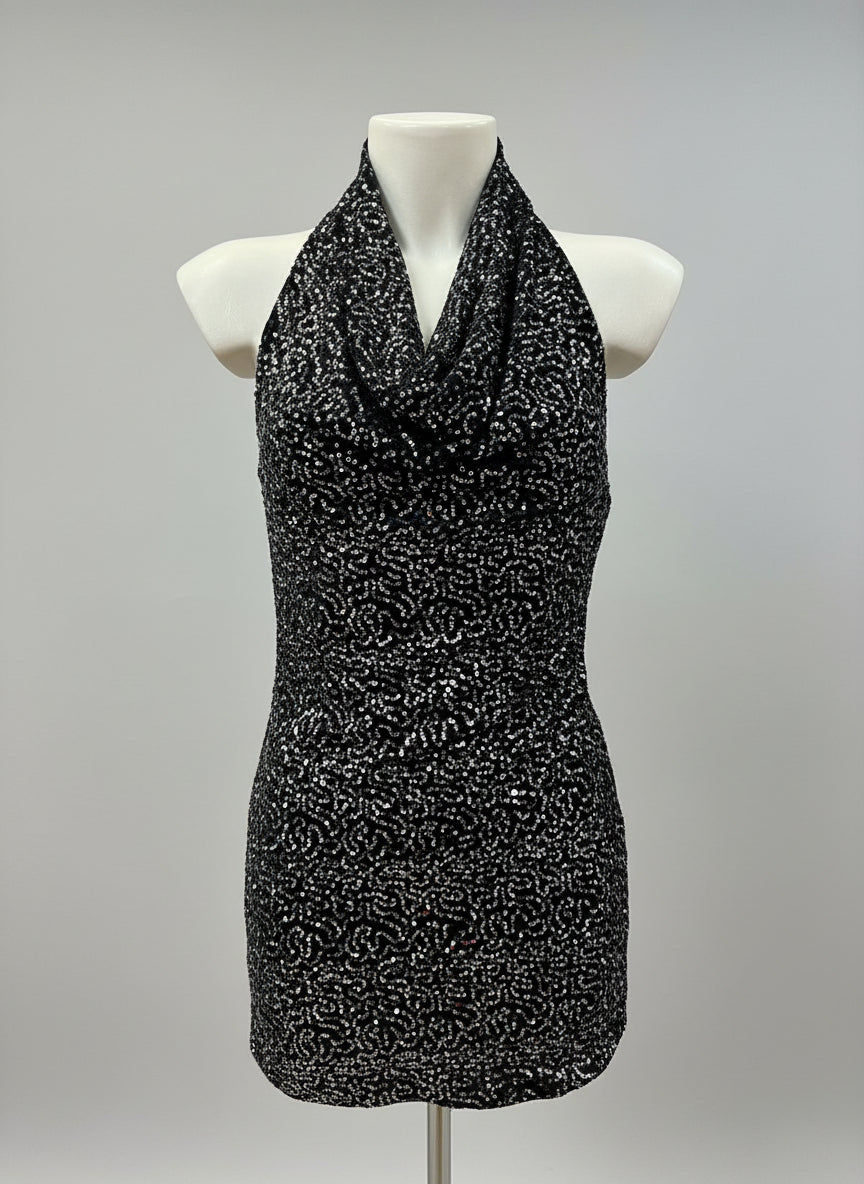 Dettagli estetici: Scollo profondo all'americana (Halter Neck), schiena semi-scoperta, interamente rivestito in paillettes brillanti.