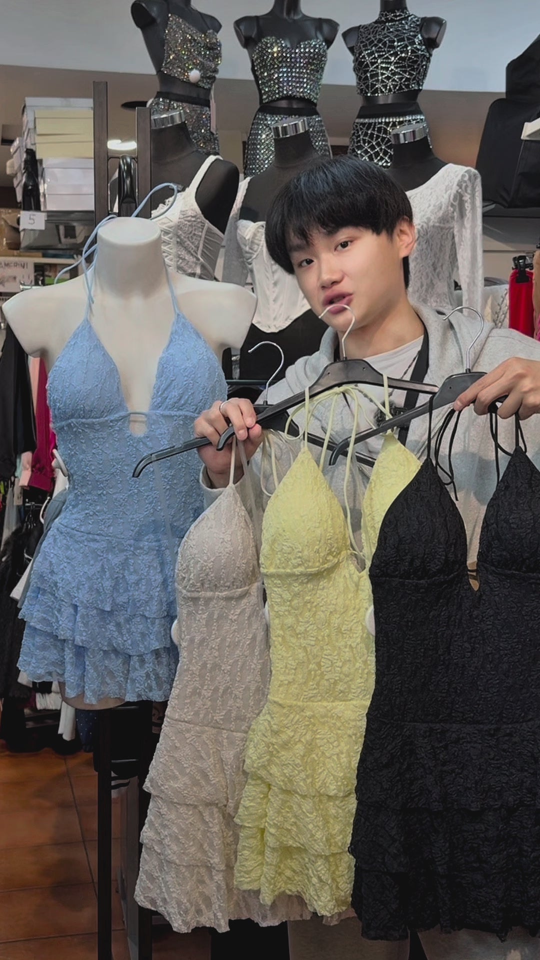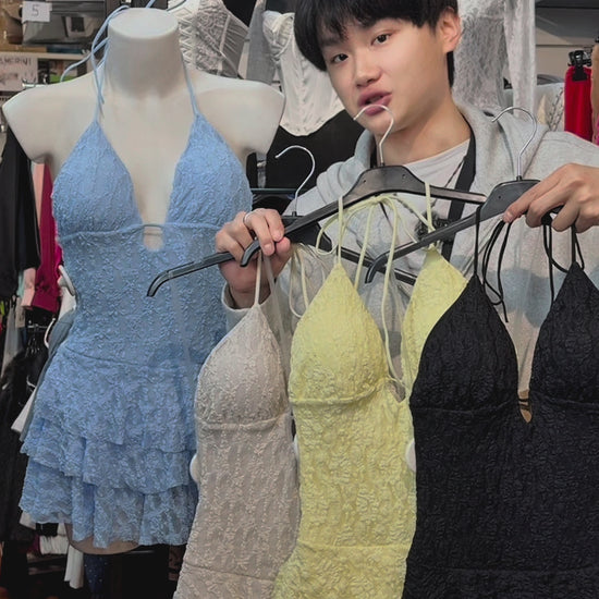Il corpetto, caratterizzato da uno scollo a V profondo e sensuale, scivola in una gonna a balze leggere che donano volume e un movimento incantevole ad ogni tuo passo. Il vero dettaglio di stile? La schiena lasciata sapientemente scoperta, incorniciata da un delicato gioco di lacci regolabili che ti permettono di personalizzare il fit, rendendolo perfetto per la tua silhouette. Che tu scelga la solarità del Giallo, la serenità dell'Azzurro, la purezza del Beige (Bianco sporco) o il fascino del Nero, sarai la musa indiscussa di ogni party.