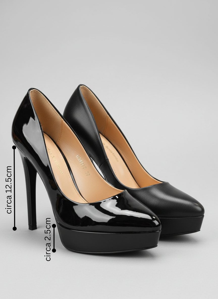 • Dettagli estetici: Tacco a spillo altissimo da 12.5 cm circa, Plateau visibile da 2.5 cm circa, punta affusolata (stiletto).