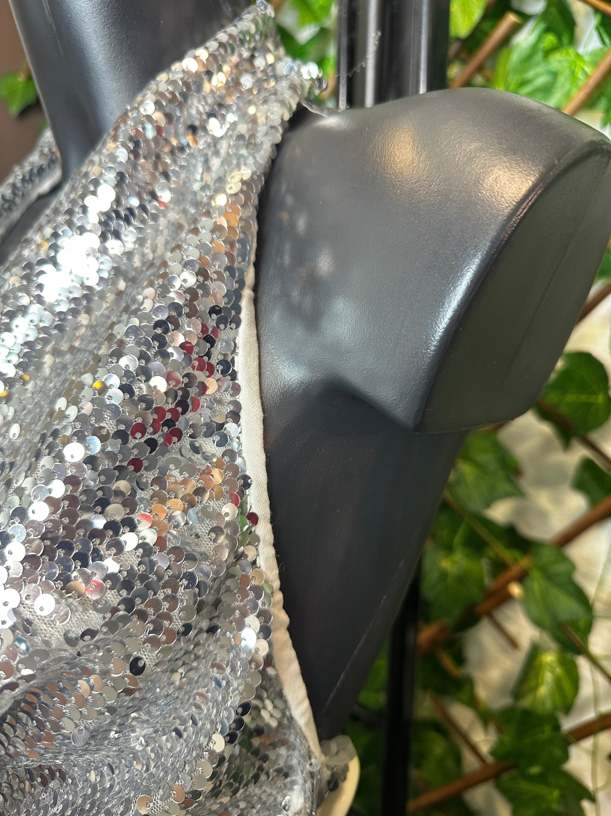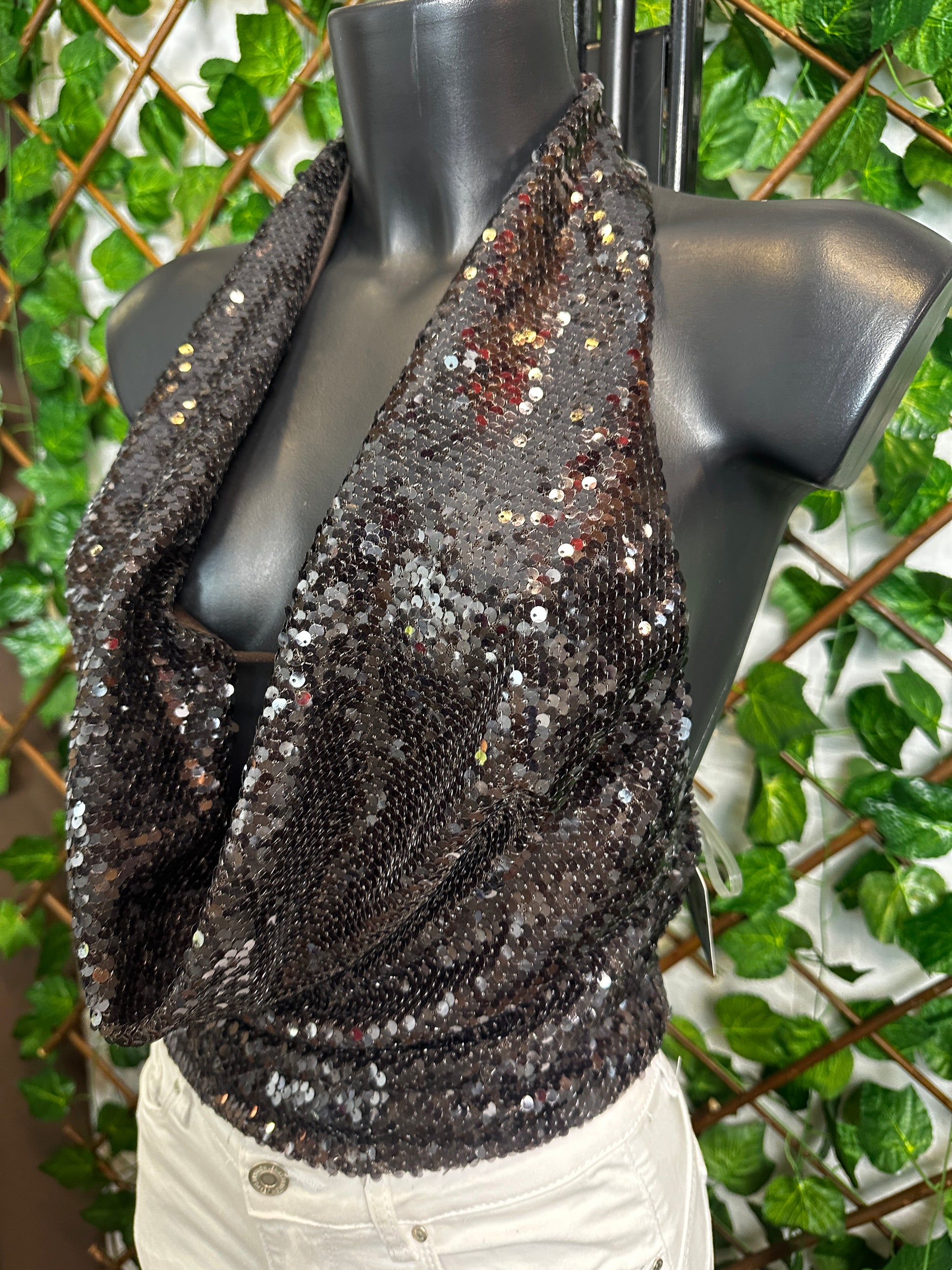 Questo top è l'ideale per una serata elegante. Realizzato in paillettes, è dotato di una scollatura profonda che mette in evidenza il décolleté e una schiena scoperta che aggiunge un tocco sensuale. La scintillante texture e il taglio elegante lo rendono perfetto per attirare l'attenzione e sentirsi al top della moda.