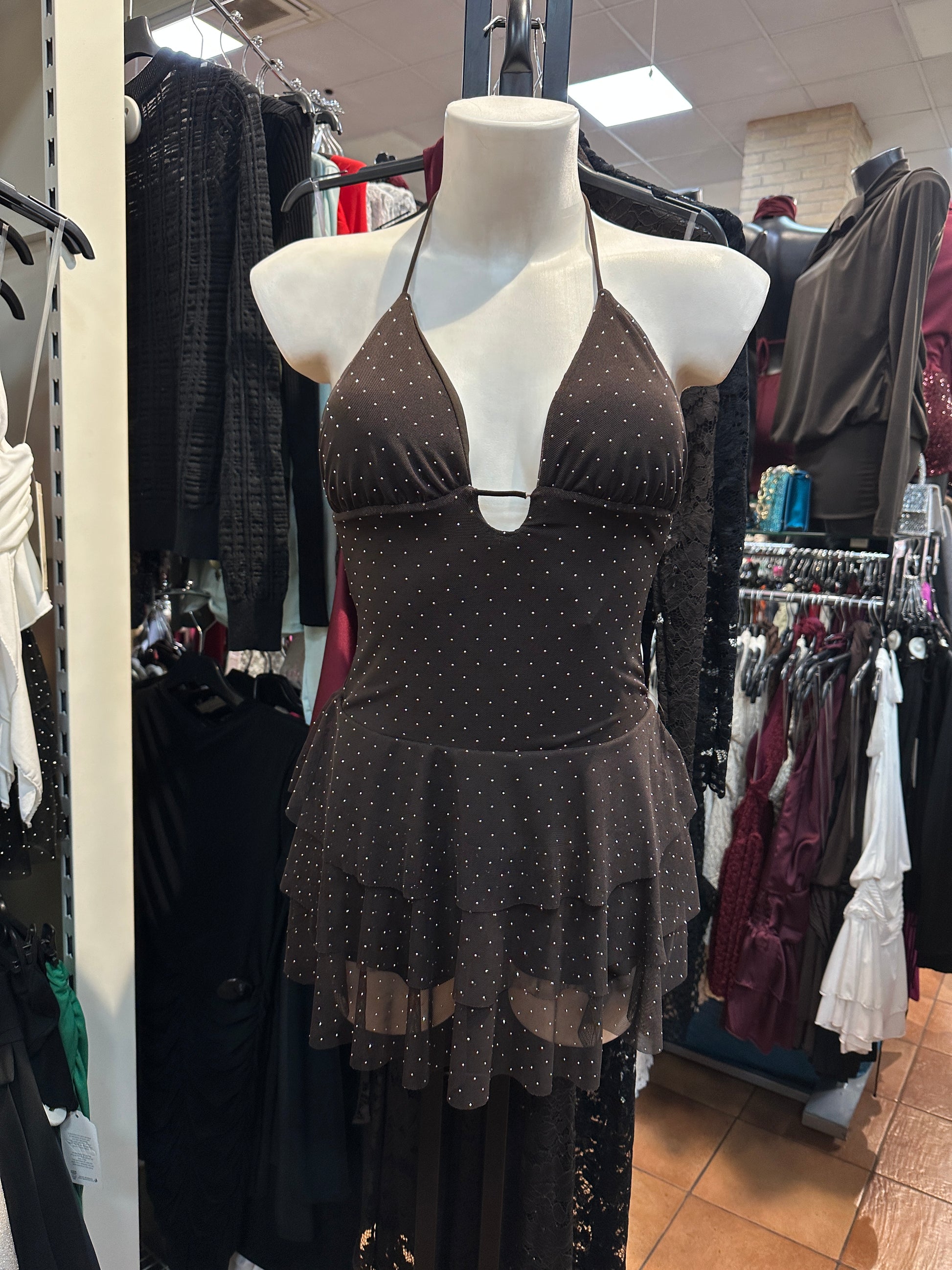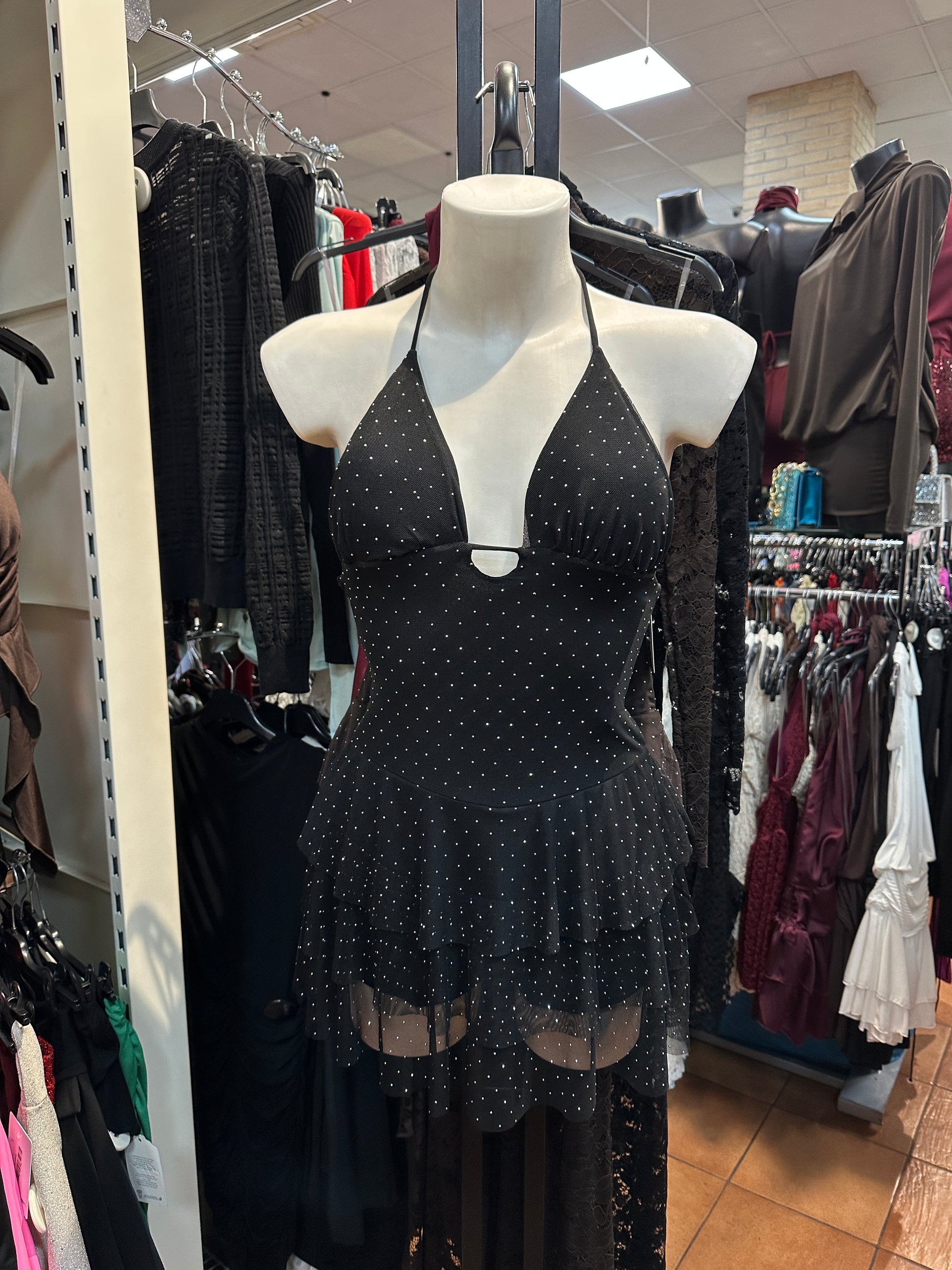 Materiale: Tessuto elasticizzato, tulle a balze, applicazione di micro punti luce (glitter/strass) ✨