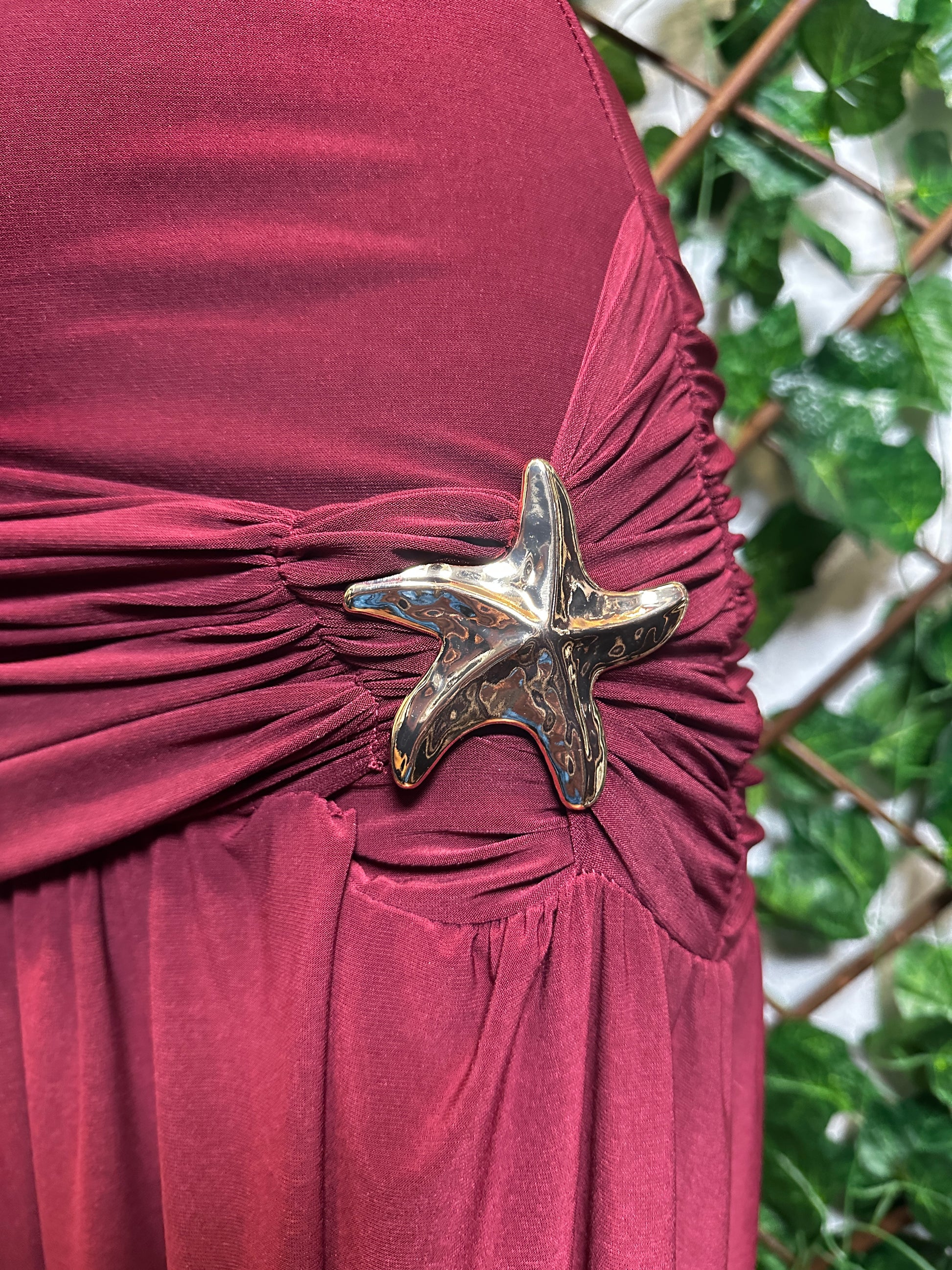 Questo vestito lungo presenta un elegante laccio sul collo e un dettaglio a forma di stella marina. Con uno spacco sul lato sinistro, dona un tocco di sensualità al tuo look. Perfetto per un'occasione speciale o una serata fuori. Realizzato con tessuti di alta qualità per il massimo comfort e stile.