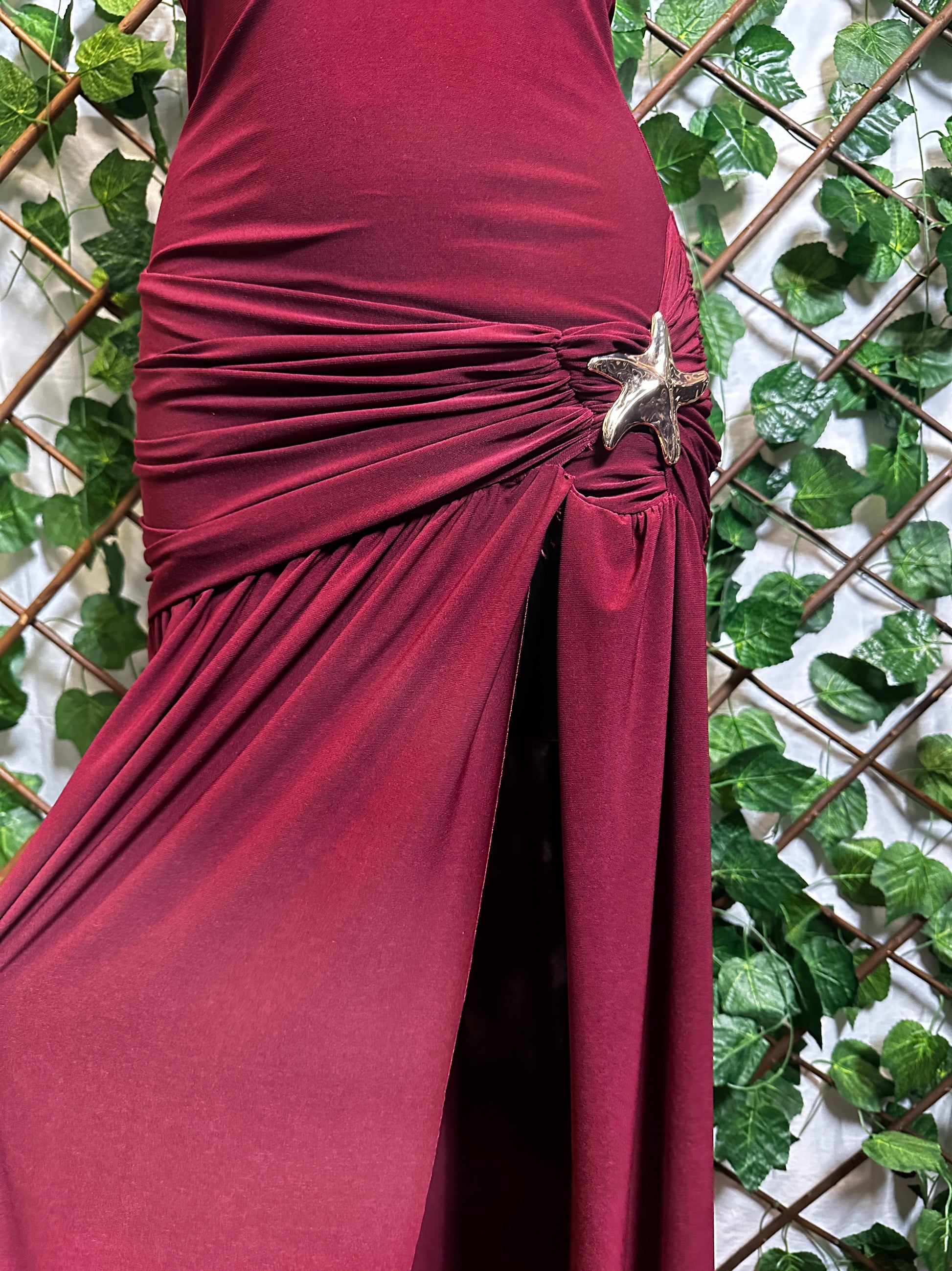 Vestito lungo con laccio sul collo, dettaglio stella marina e lo spacco sul lato sinistro